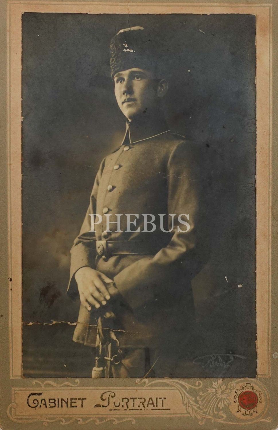 Cihan Harbi yıllarından kılıcıyla poz veren bir Türk subayının, "Ferid İbrahim" soğuk damgalı kabin fotoğrafı, 11x17 cm...
