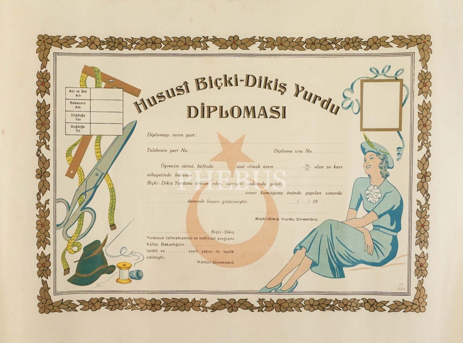 Hususî Biçki-Dikiş Yurdu Diploması, doldurulmamış, 43x32 cm...