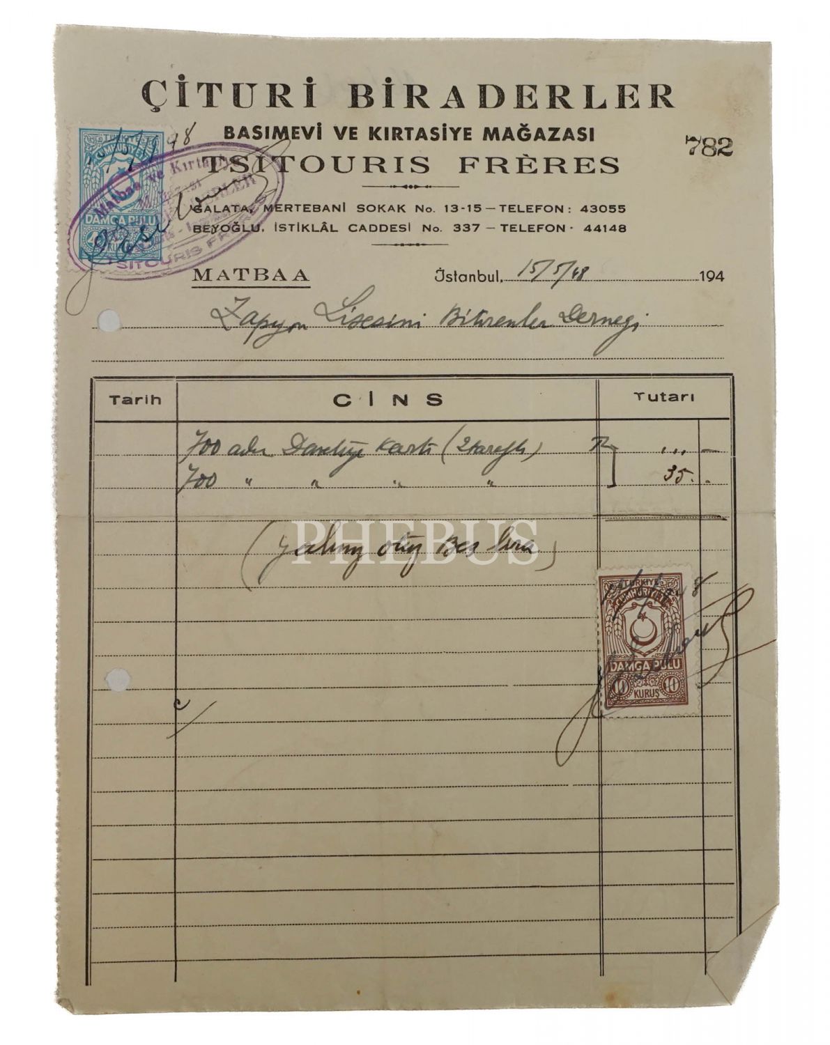 "Çituri Biraderler Basımevi ve Kırtasiye Mağazası (Tsitouris Freres)" antetli fatura, 16x22 cm...