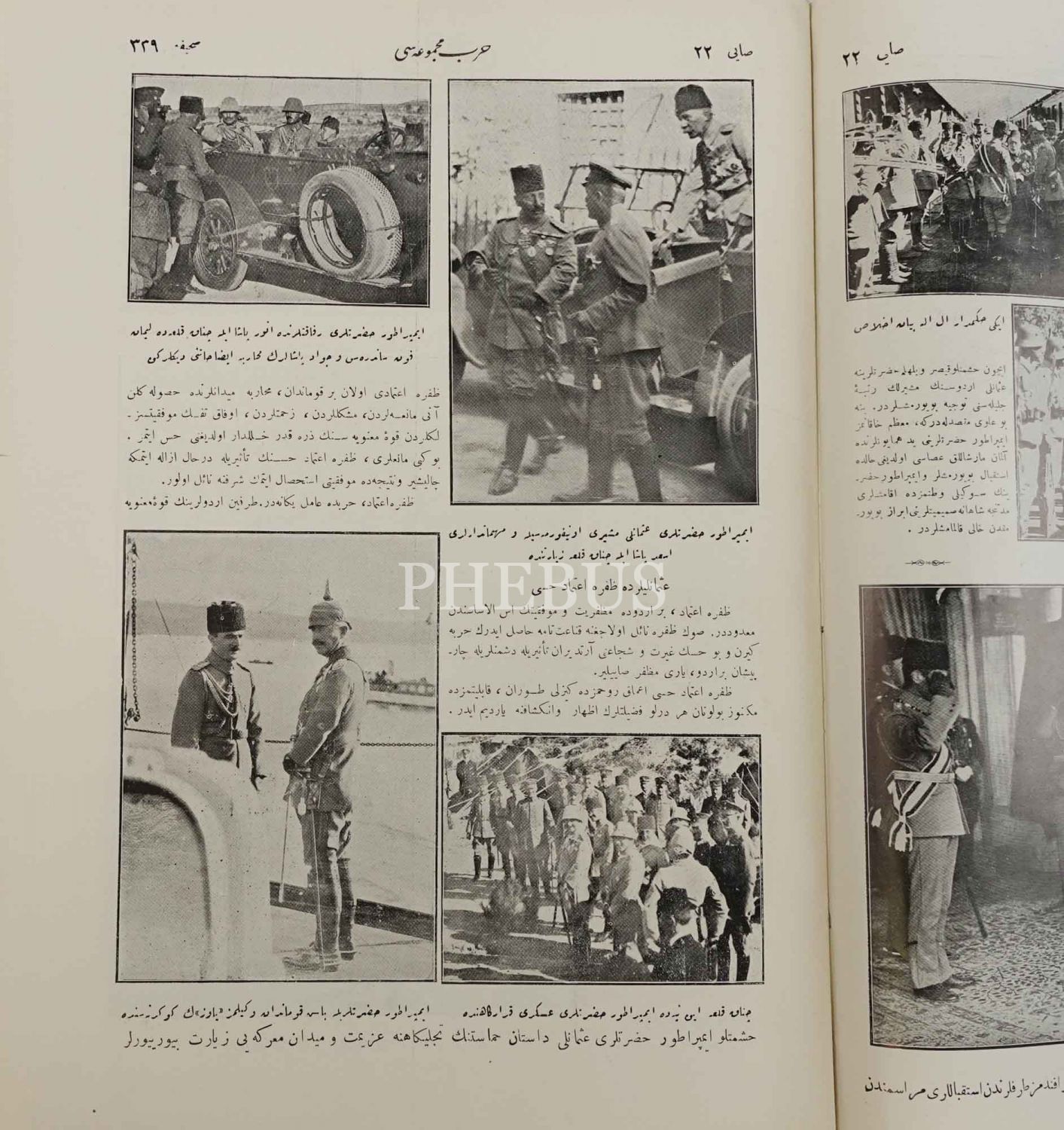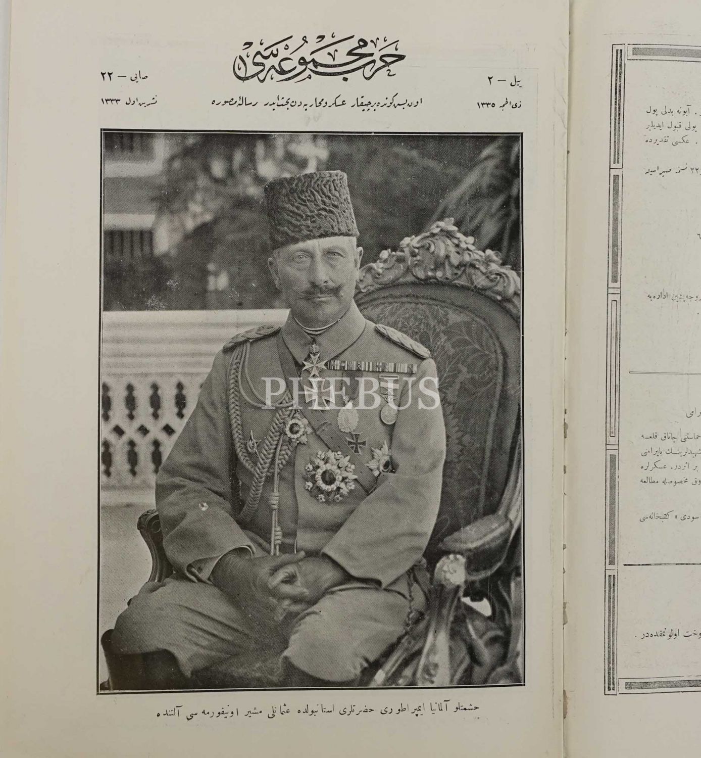 İç kapağında, Kayzer II. Wilhelm´in Osmanlı mareşal üniformasıyla çektirdiği fotoğrafına yer verilen HARP MECMUASI´nın 1335 Zilhicce tarihli 23. sayısı, 26x35 cm...