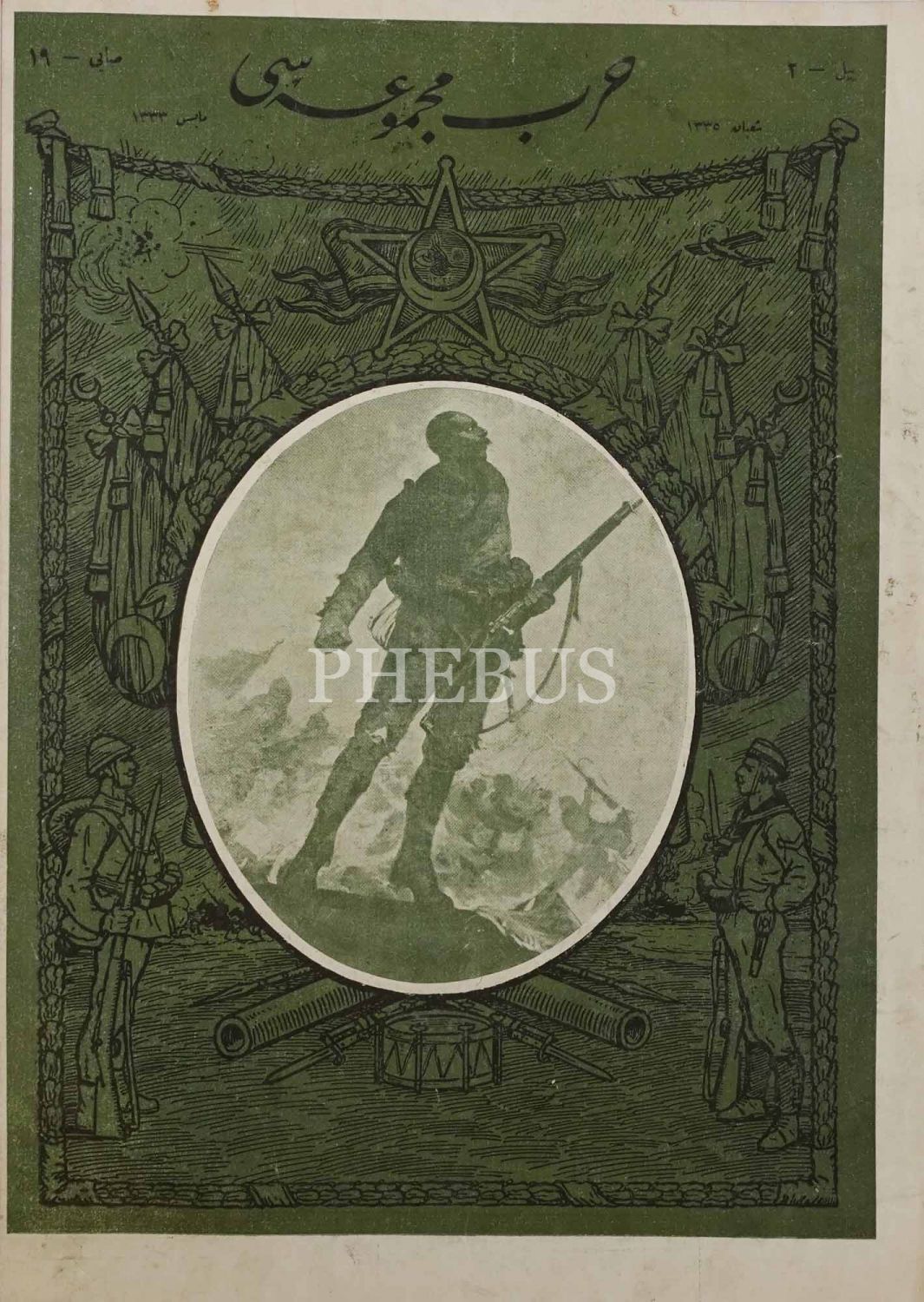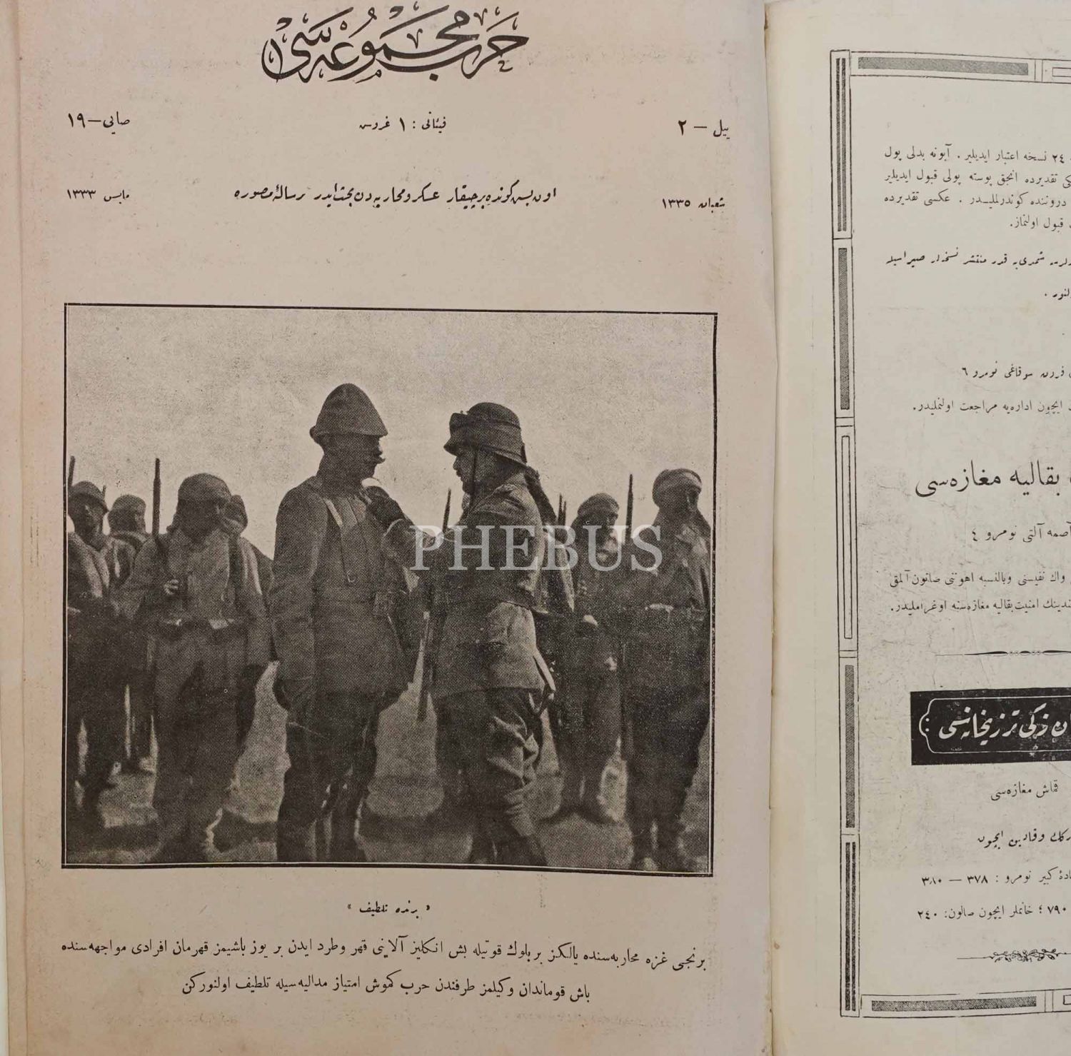 İç kapağında, Birinci Gazze Muharebesi´nde yalnızca bir bölükle beş İngiliz Alayı´nı yenen yüzbaşına Enver Paşa tarafından Gümüş madalya taltif olunurken çekilmiş fotoğrafına yer veren HARP MECMUASI´nın Şaban 1335 tarihli 19. sayısı, 26x35 cm...