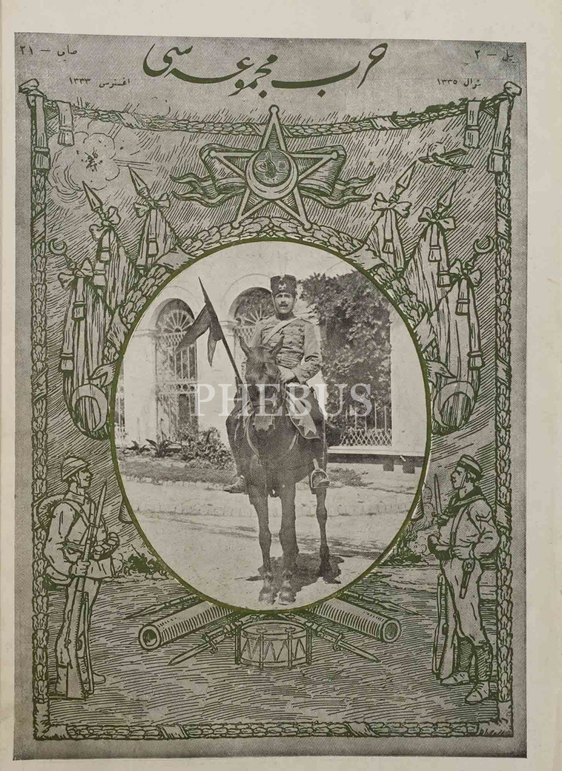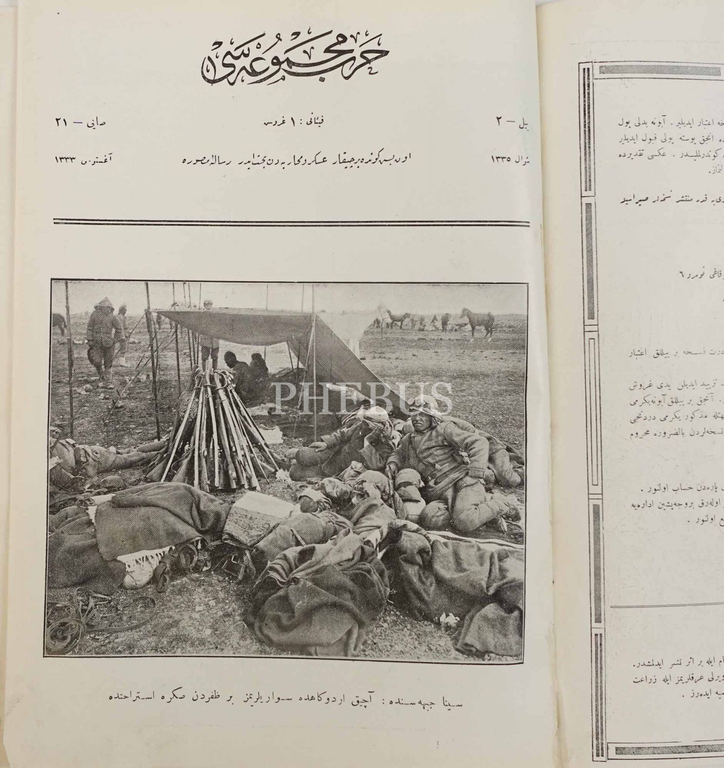 İç kapağında, Sina Cephesi´nde bir zafer alındıktan sonra istirahat eden Osmanlı süvarilerinin fotoğrafına yer veren HARP MECMUASI´nın Şevval 1335 tarihli 21. sayısı, 26x35 cm...