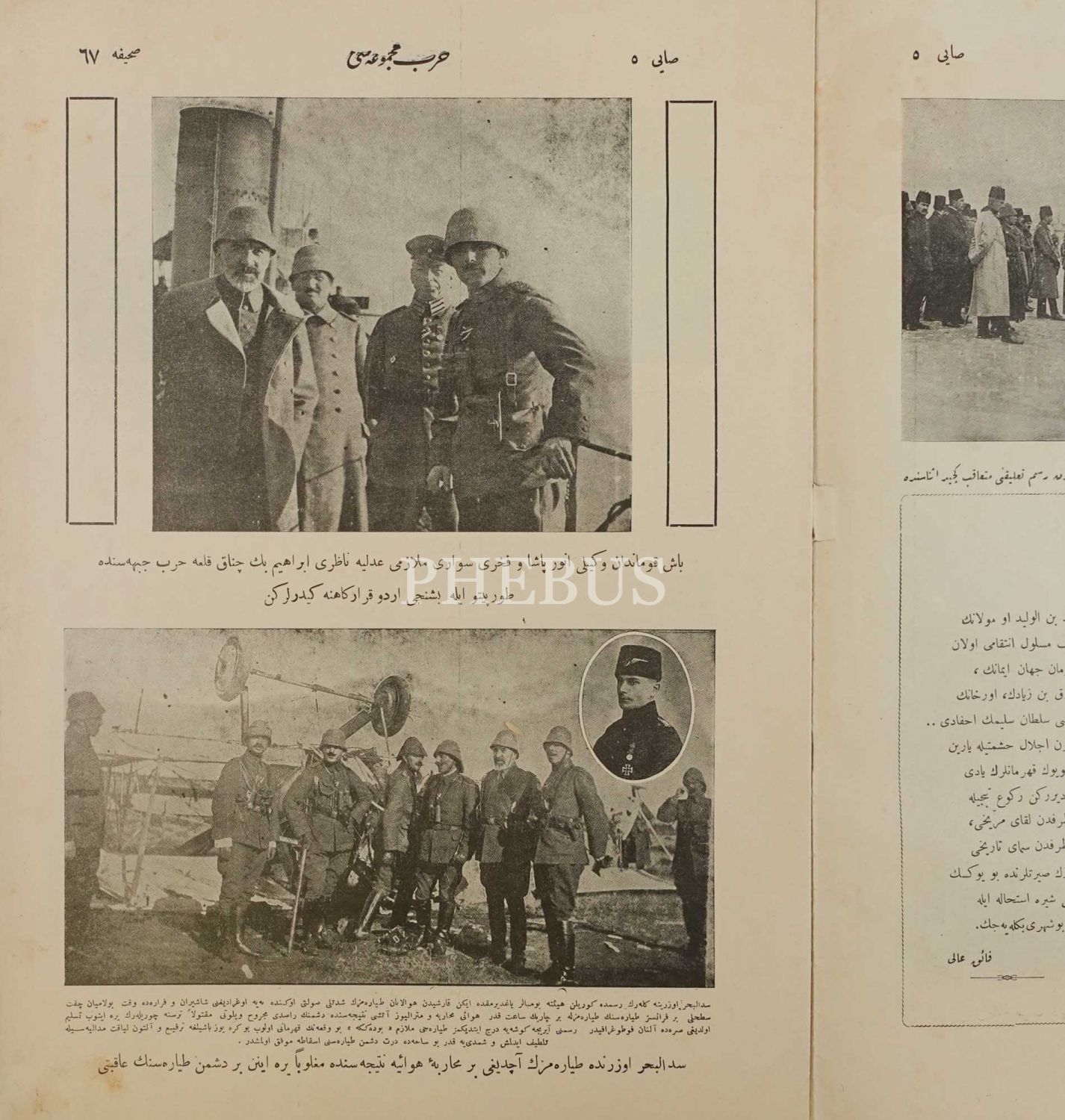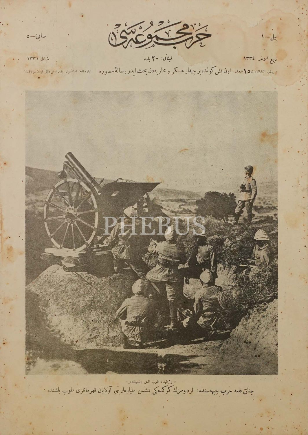 "Çanakkale Harb Cephesi´nde: Ordumuzun gökteki düşman tayyarelerini avlayan kahramanları top başında" başlıklı, Çanakkale Cephesi´nde uçaksavar topu başında Türk askerleri görselli, HARP MECMUASI´nın 1334 tarihli 5. sayısı, 16 sayfa, 24x34 cm...