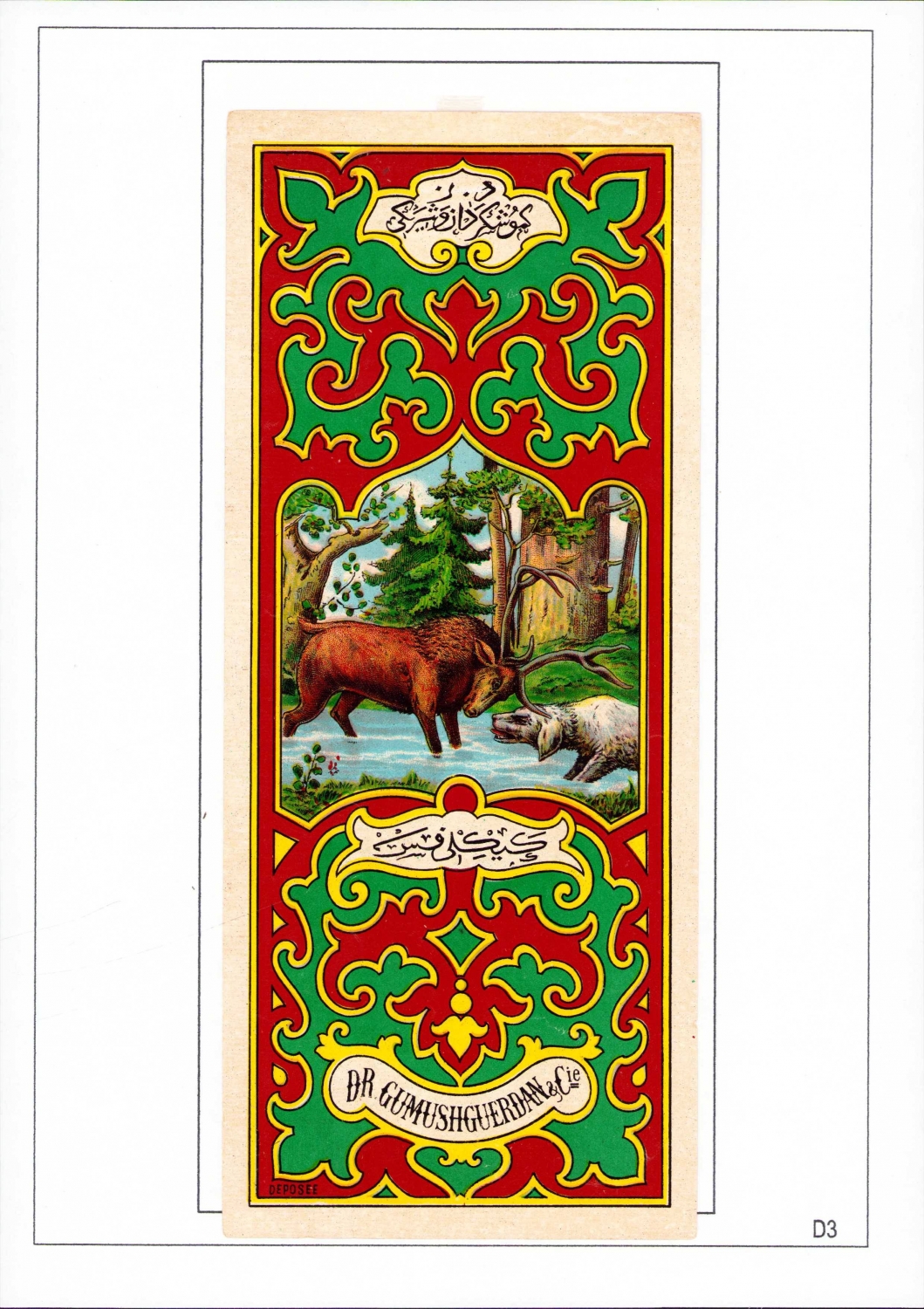 Osmanlı dönemi fes etiketi, Osmanlıca Geyikli Fez yazılı, Ermeni firma Gumushguerdan, 11x23 cm