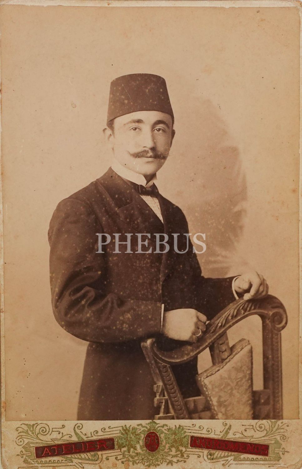 Kaytan bıyıklı, papyonlu, şık bir beyefendinin portre fotoğrafı, Nicolas Andriomenos, Constantinople, 11x17 cm...
