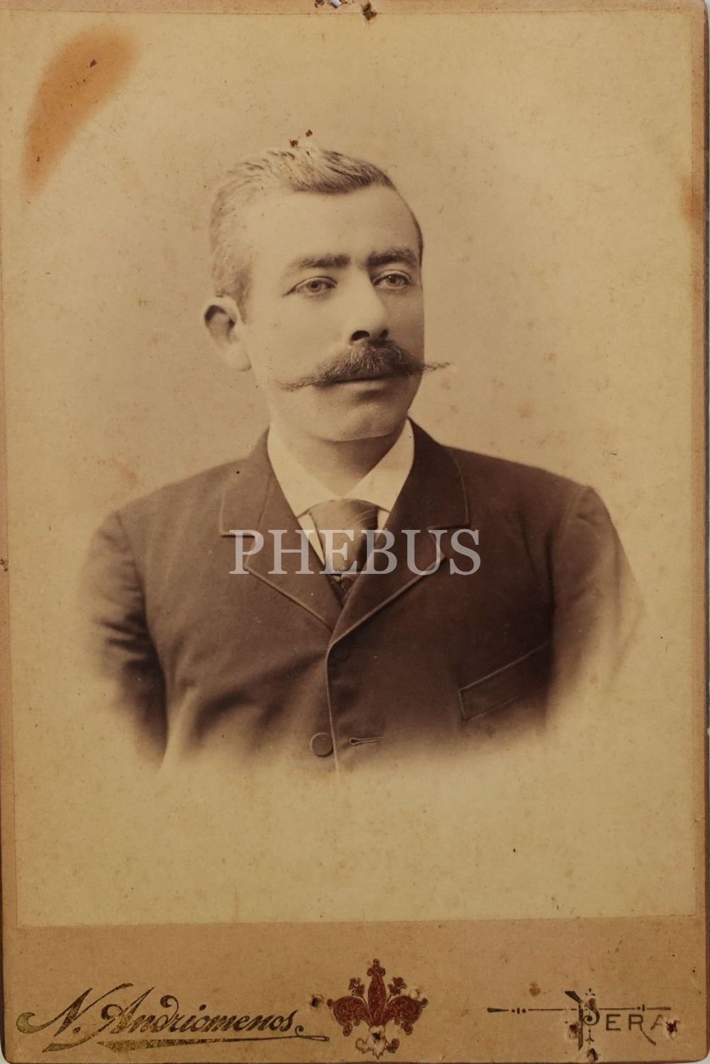 Uzun bıyıklı bir beyefendinin portre fotoğrafı, Nicolas Andriomenos, Constantinople, 11x16 cm...