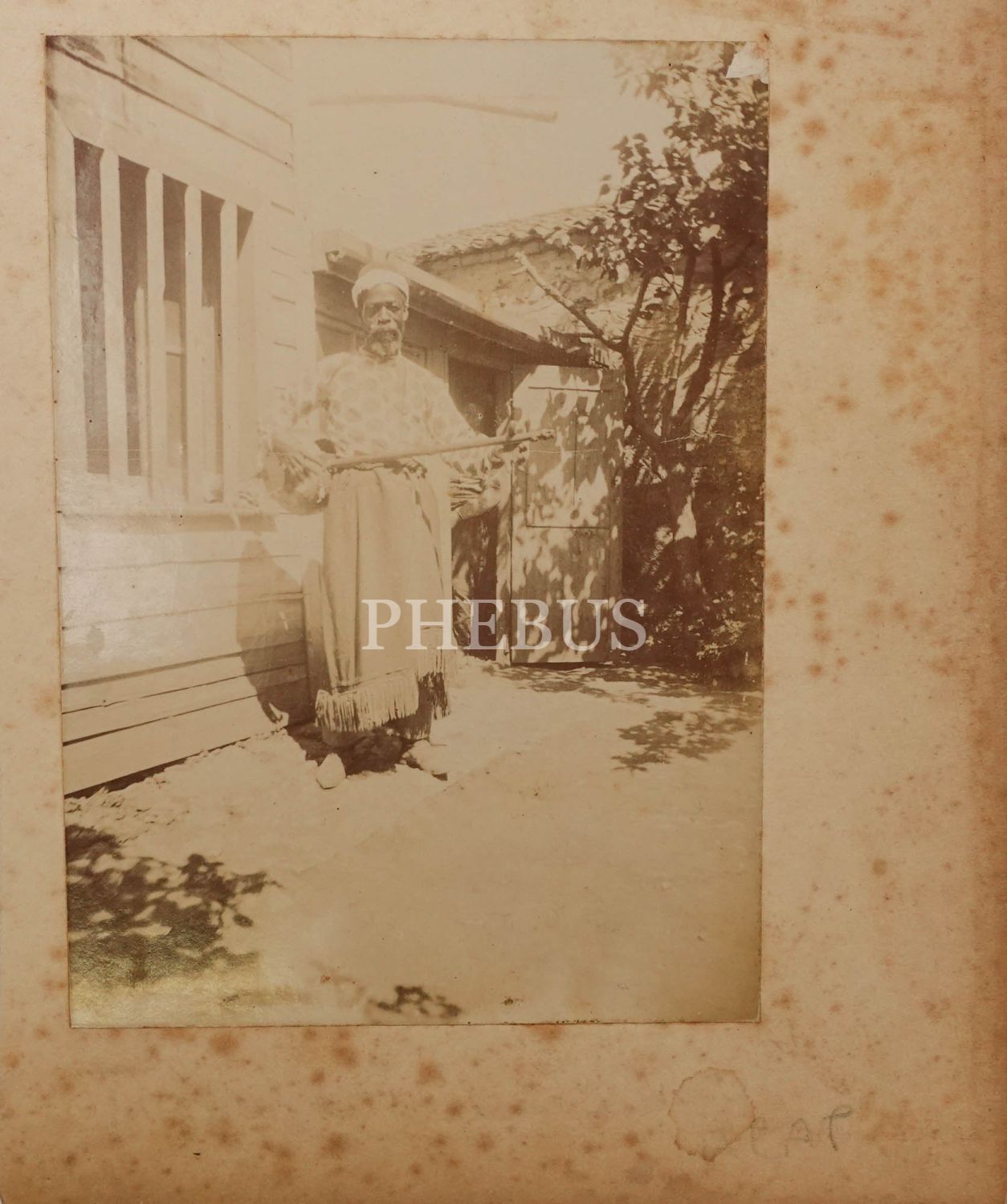 Elinde sazıyla poz veren yöresel kıyafetli, Doğulu beyefendi, fotoğraf 8x11 cm, paspartu 12x14 cm...
