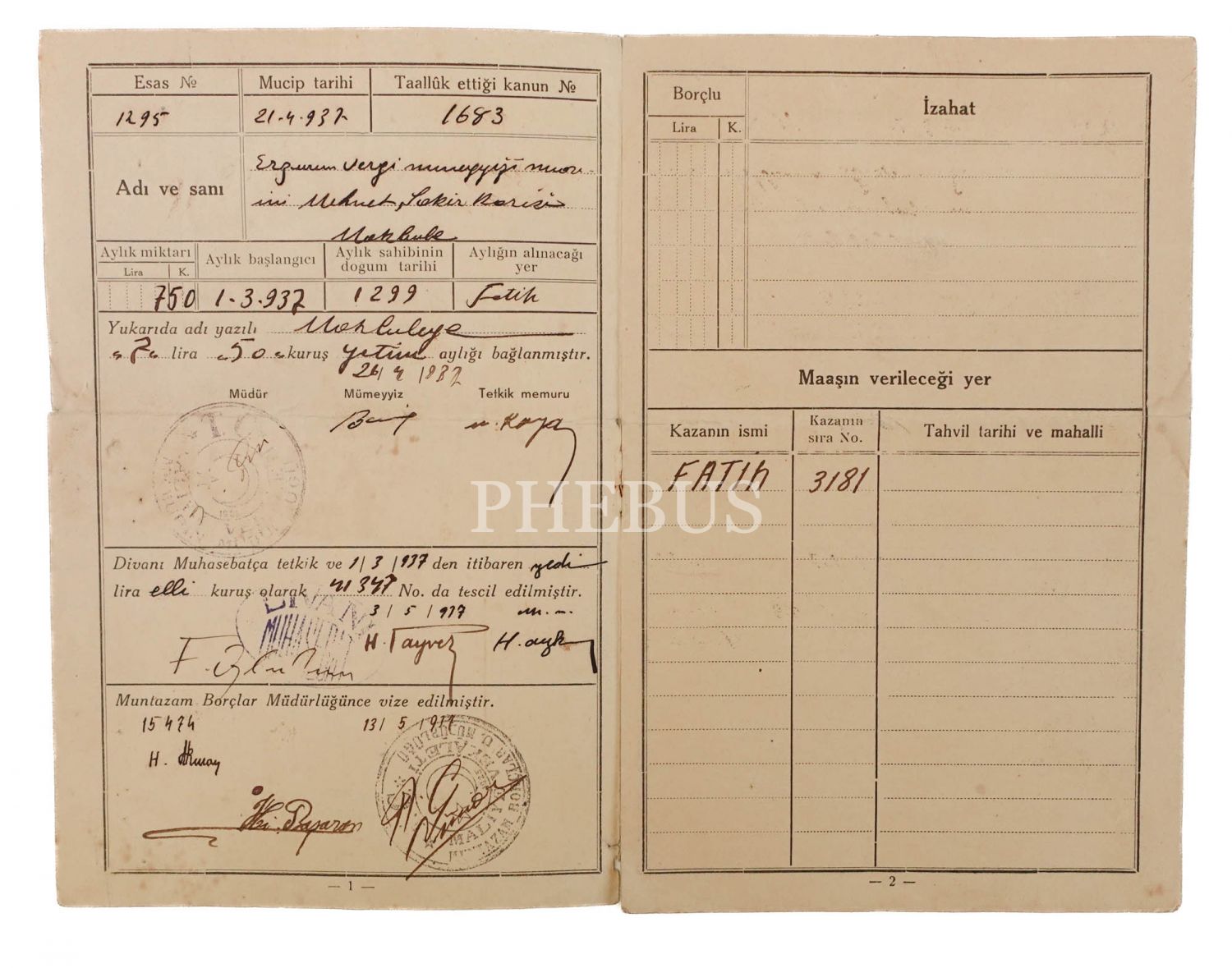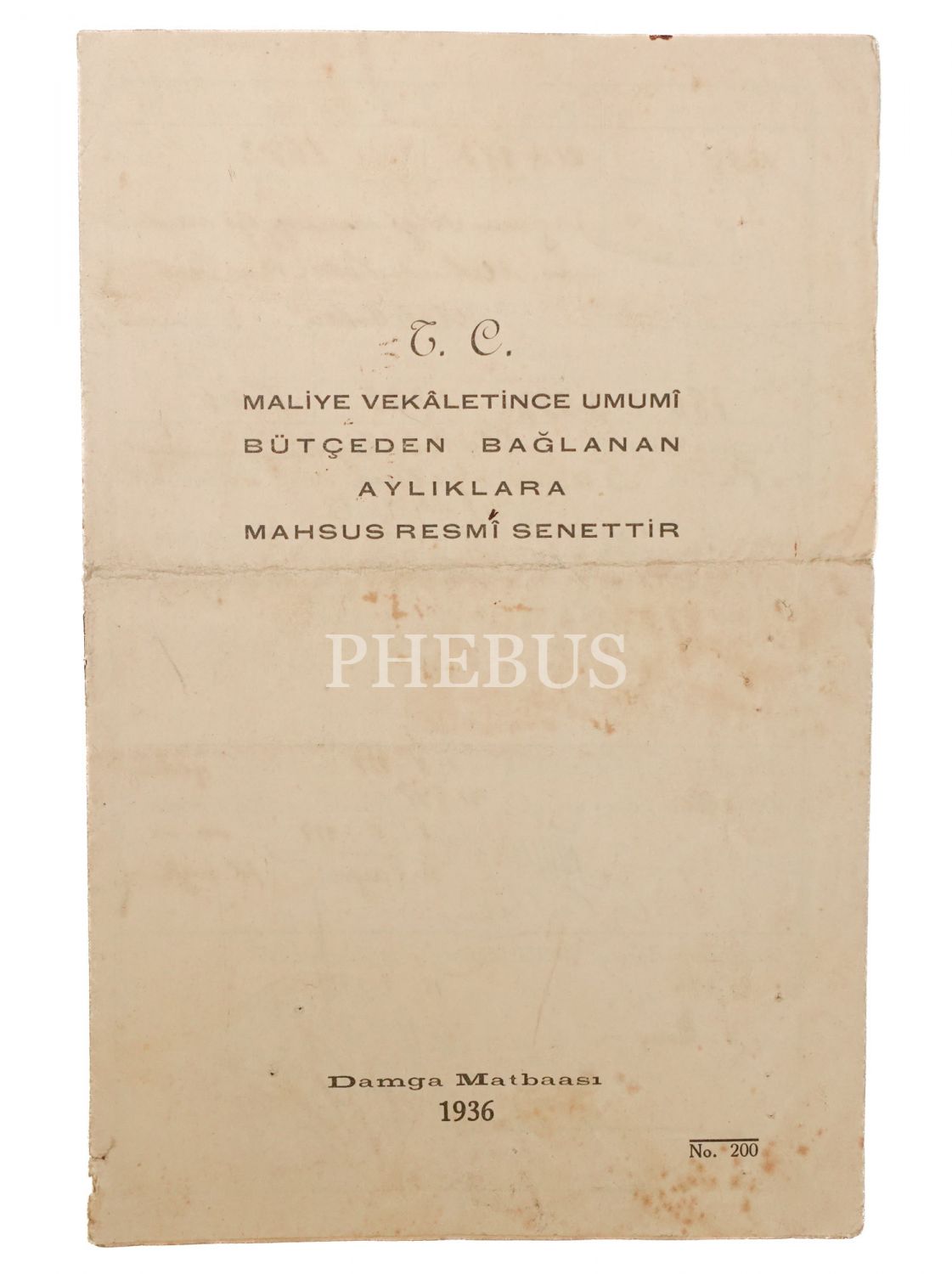 T.C. Maliye Vekâletince Umumî Bütçeden Bağlanan Aylıklara Mahsus Resmi Senettir, 1936, Damga Matbaası, 6 sayfa, 13x19 cm...