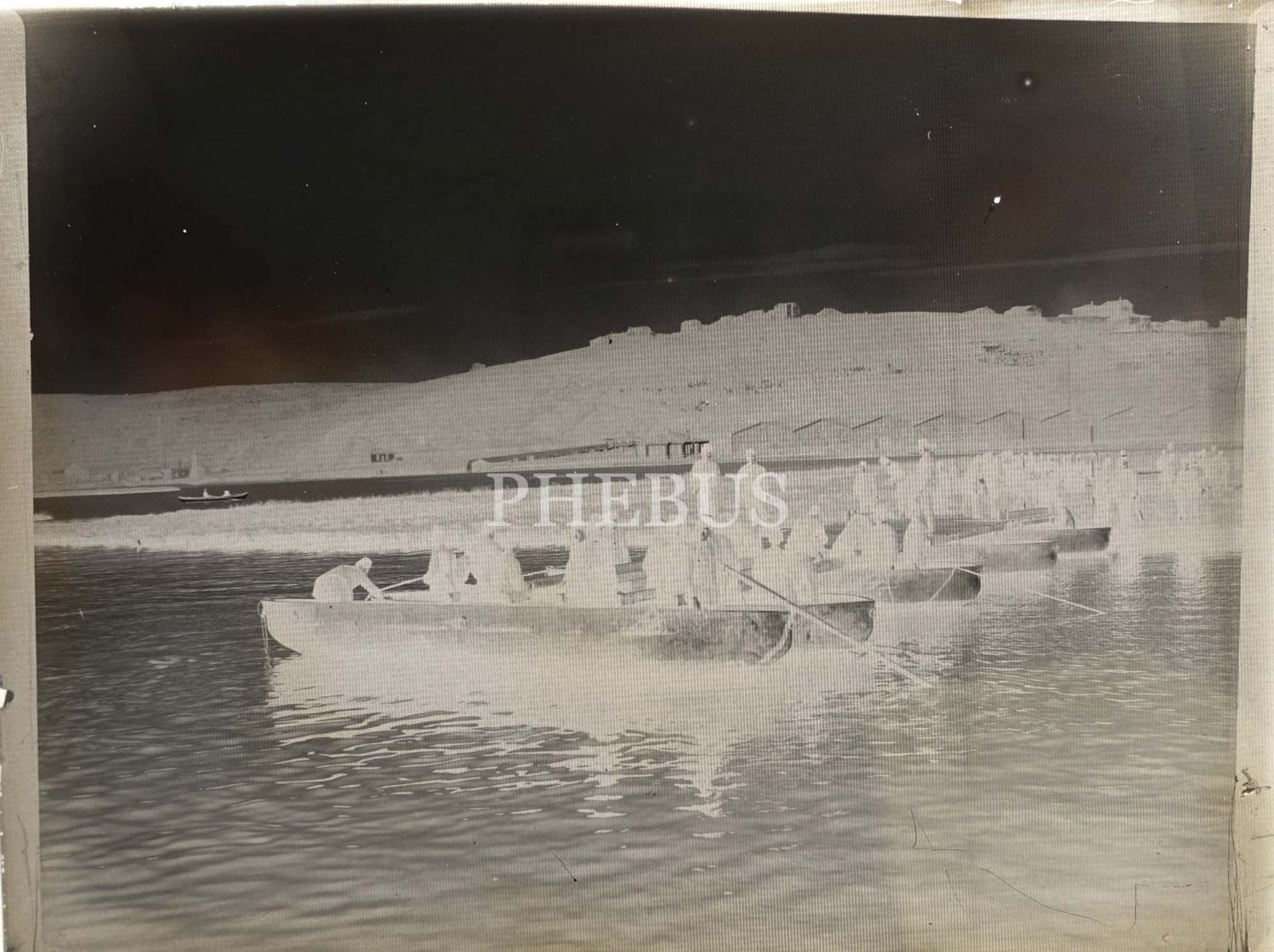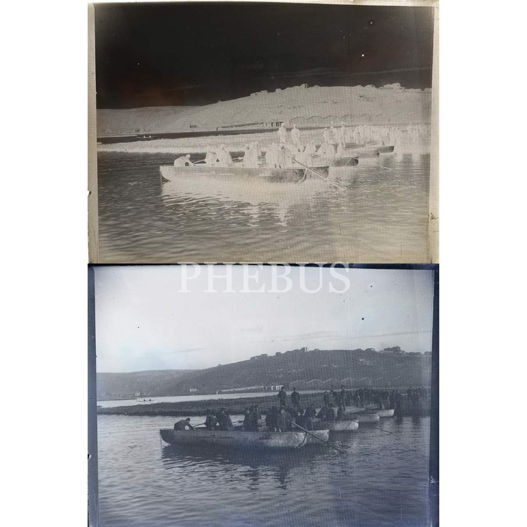 Kayıklarla köprü kuran bir grup Türk askerinin cam negatif fotoğrafı, 12x9 cm...