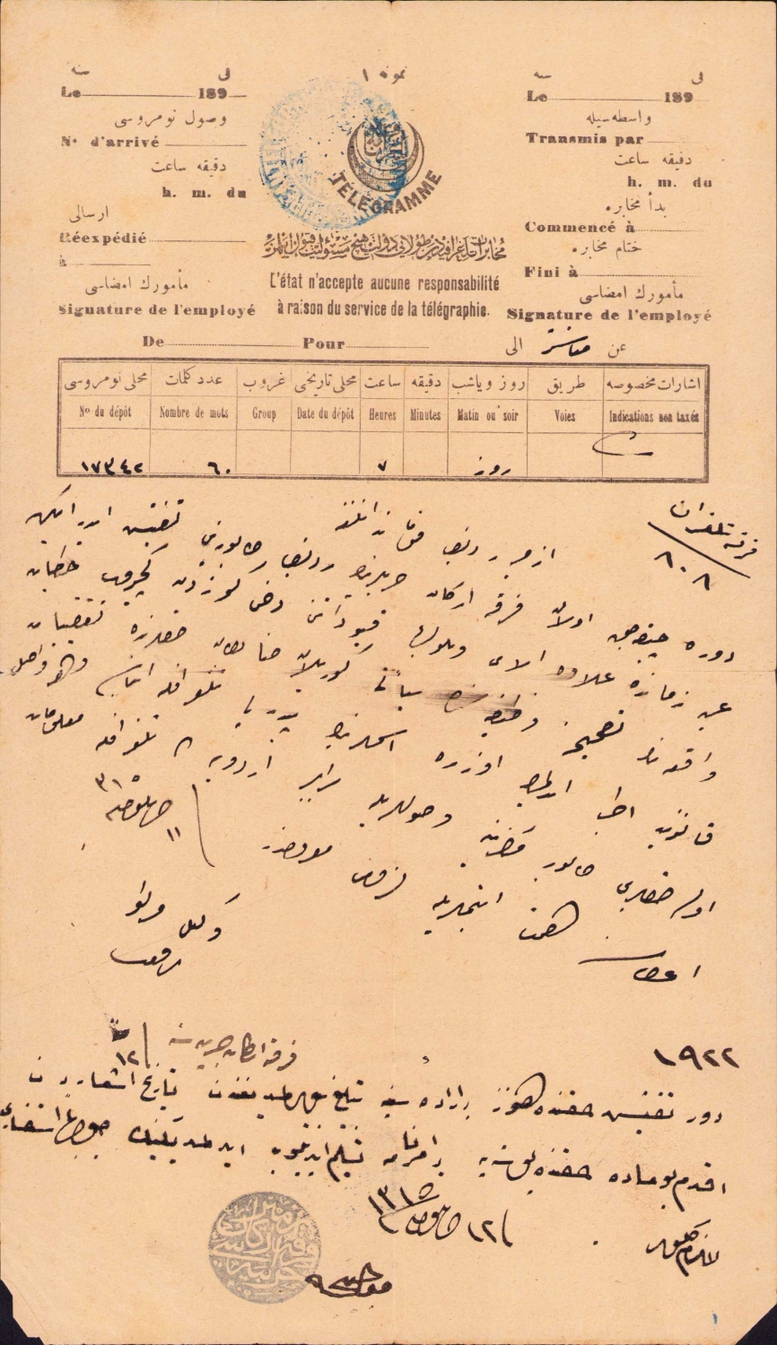 Osmanlıca telgraf, İzmir redif kumandanlığına gönderilmiş devriyeye çıkacak olan fırka erkanı harbiyesine destek olarak ilave bölük takviyesi, İzmir Erkanı harbiyesi damgalı, 16x28 cm
