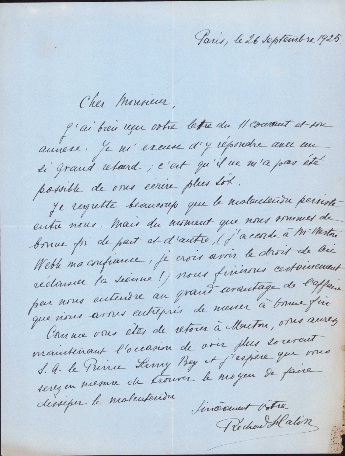 Reşad Halim Bey imzalı mektup, Paris 1925, 20x28 cm
