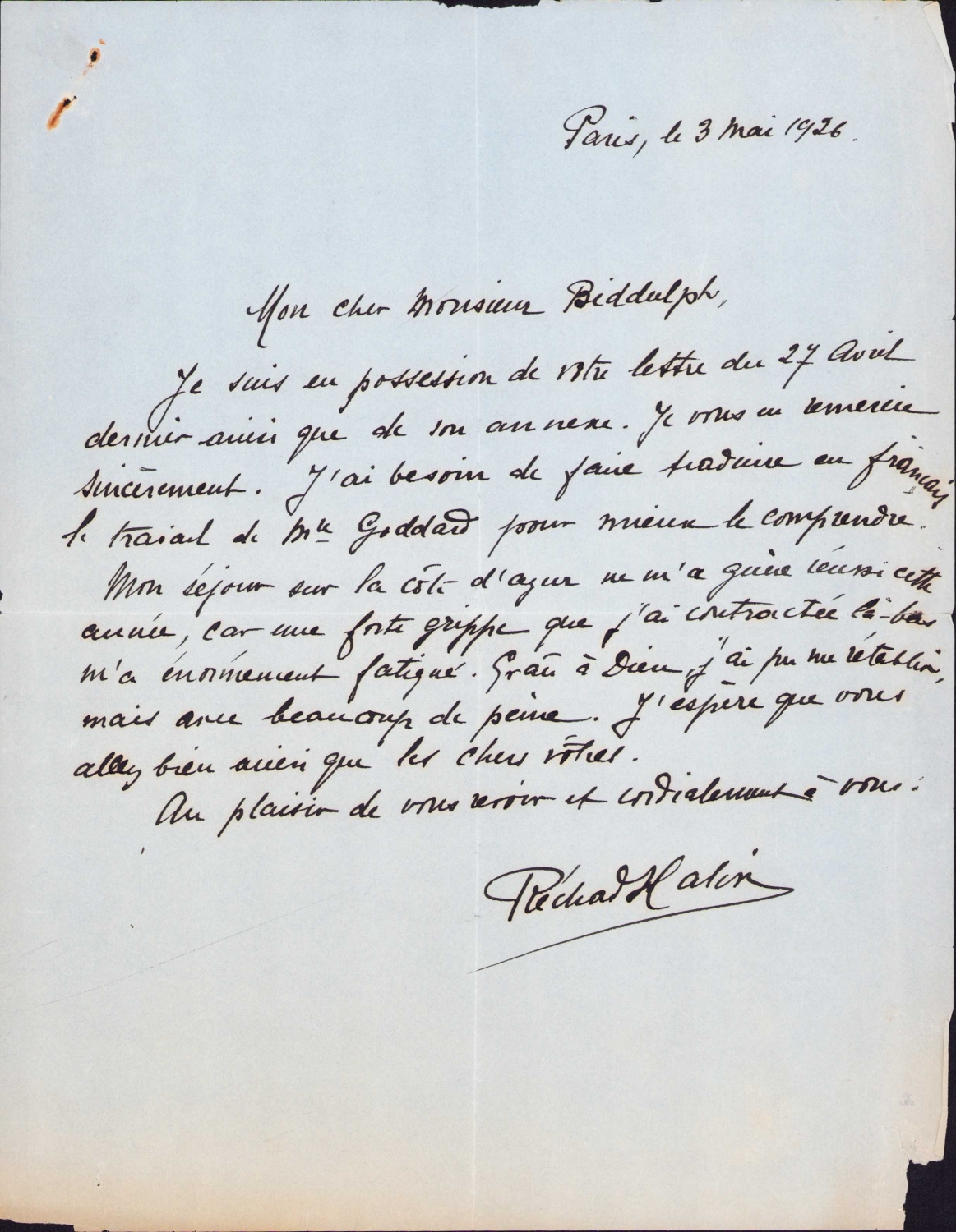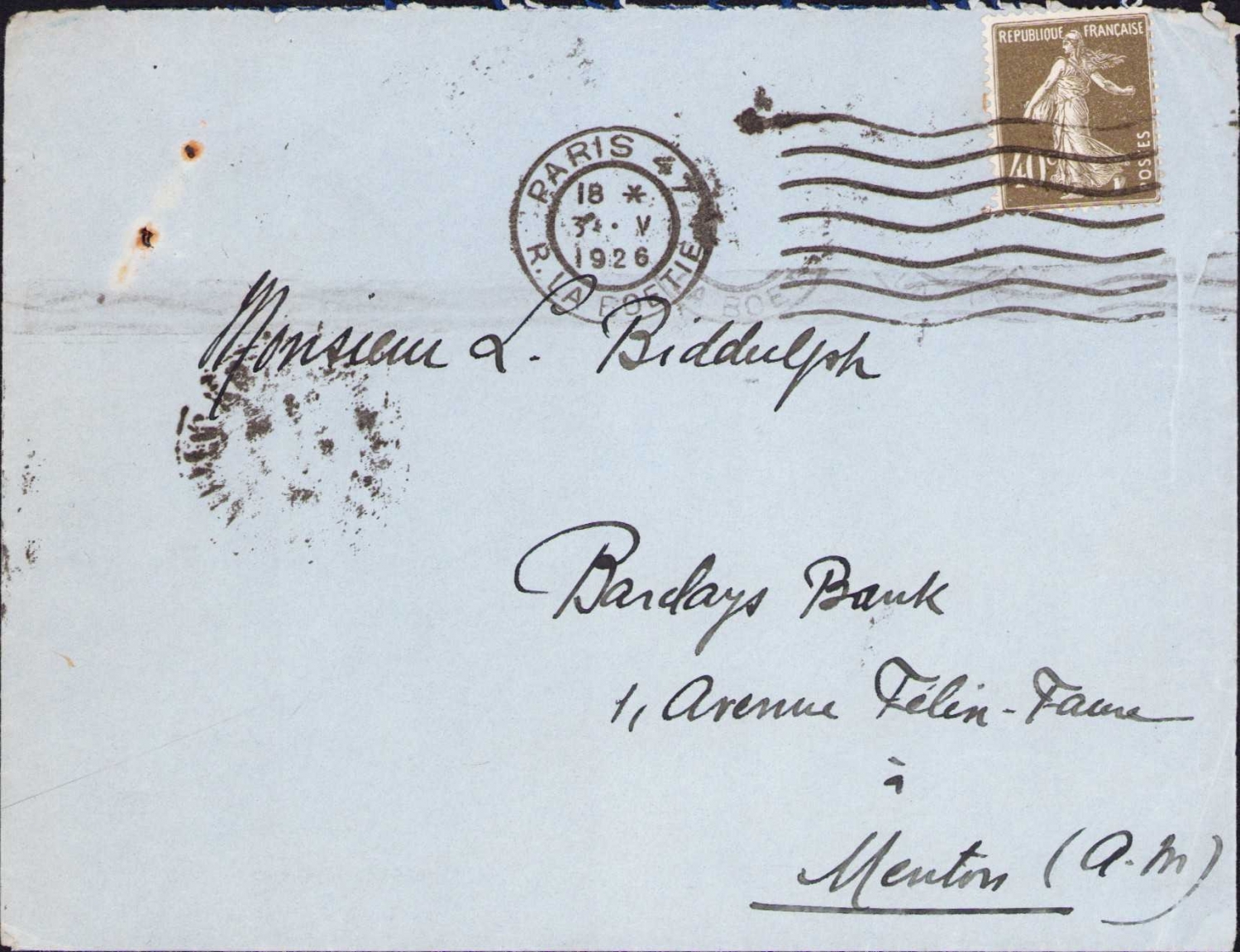 Reşad Halim Bey imzalı mektup, Paris 1925, Paris damgalı postadan geçmiş zarf