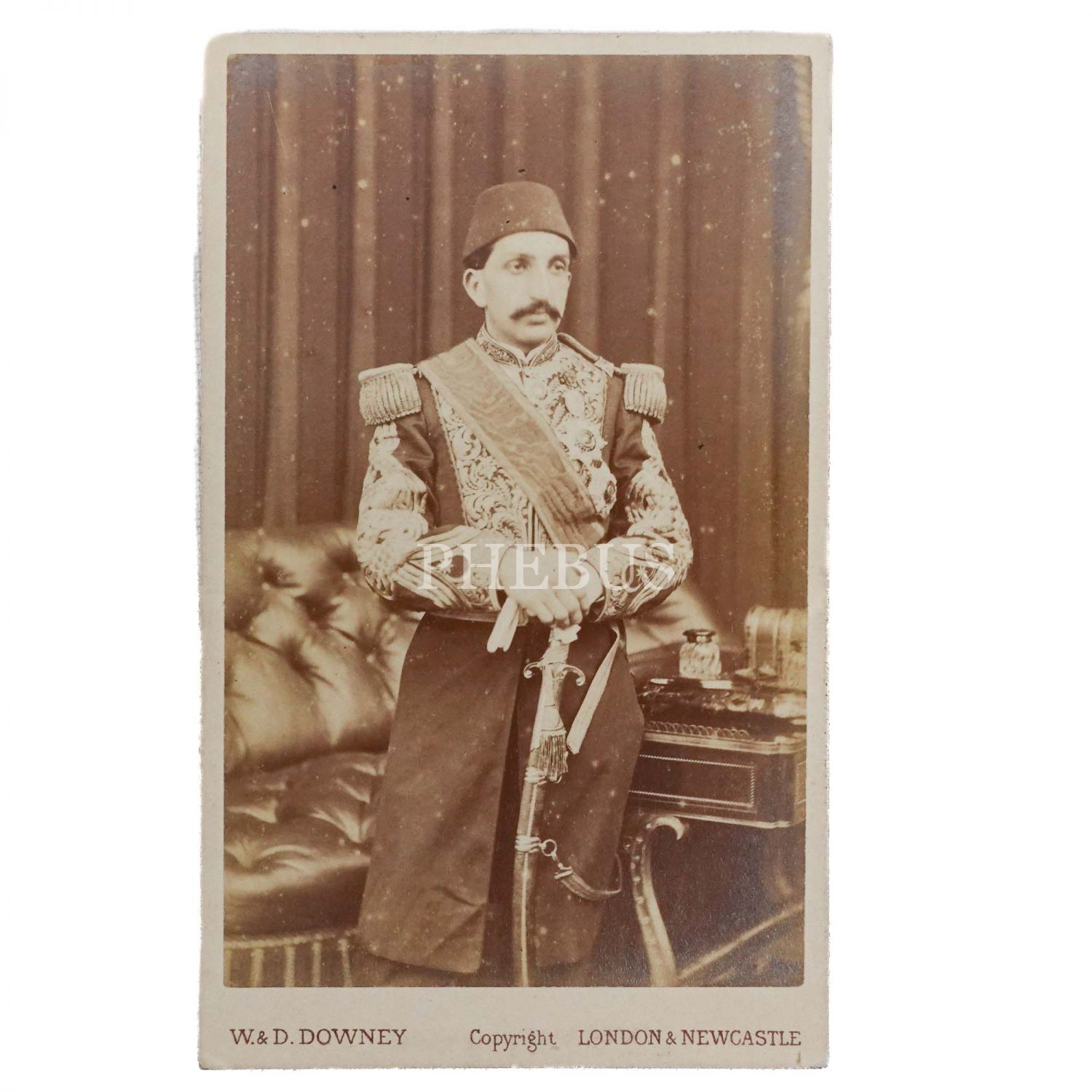 1867 yılında amcası Sultan Abdülaziz´in Büyük Britanya ziyaretine eşlik eden Şehzade Abdülhamid´in, İskoçya´da bulunan Balmoral Kalesi´nde çekilen iki meşhur fotoğrafından birinin CDV (kartvizit) boy dönem baskısı, W.&D. Downey, London, 6,5x10 cm...