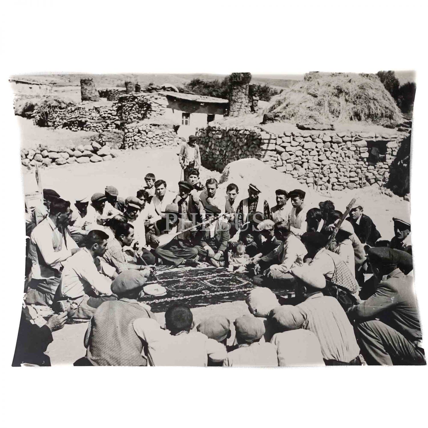Ara Güler´in objektifinden, saz çalan Âşık Veysel´i dinleyen Şarkışla - Sivrihisar Köyü sakinleri, arka yüzü "Photo by Ara Güler" damgalıdır, 24x18 cm...