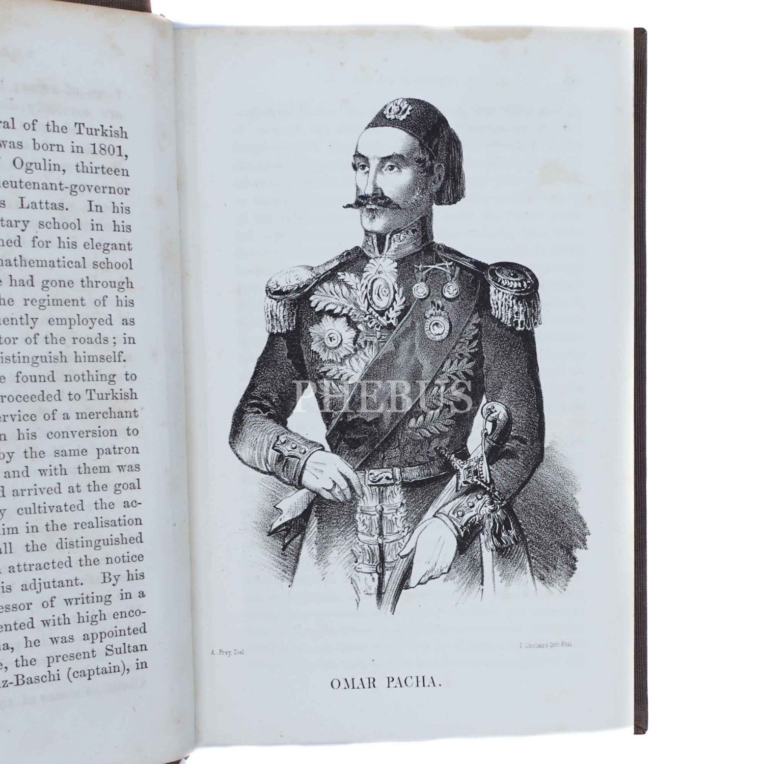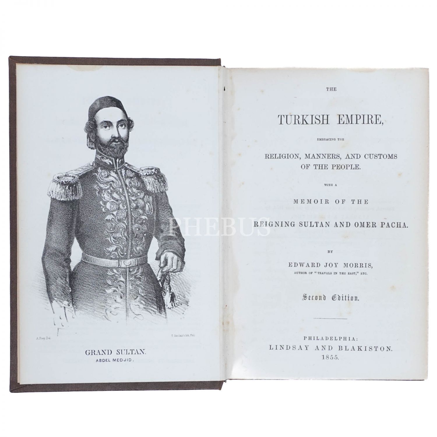 Alfred de Besse´in, "Das Türkische Reich" ismiyle Almanca kaleme aldığı ve imparatorluğun toplumsal ve siyasi tarihini mercek altına aldığı eserinin, 1861-1870 yılları arasında Amerika´nın İstanbul Sefiri olarak görev yapacak olan Edward Joy Morris tarafından çeşitli eklemelerle yayımlanan İngilizce tercümesi... Kitapta, Sultan Abdülmecid´in ve veliahtlığı döneminde Sultan Abdülmecid´in hocalığını üstlenen Serdar-ı Ekrem Ömer Lütfi Paşa´nın gravürleri yer almaktadır. Ön ve arka kapağı gofre dekor içinde inisiyalli, sırtı altın yaldız başlıklı orijinal cildi içinde...