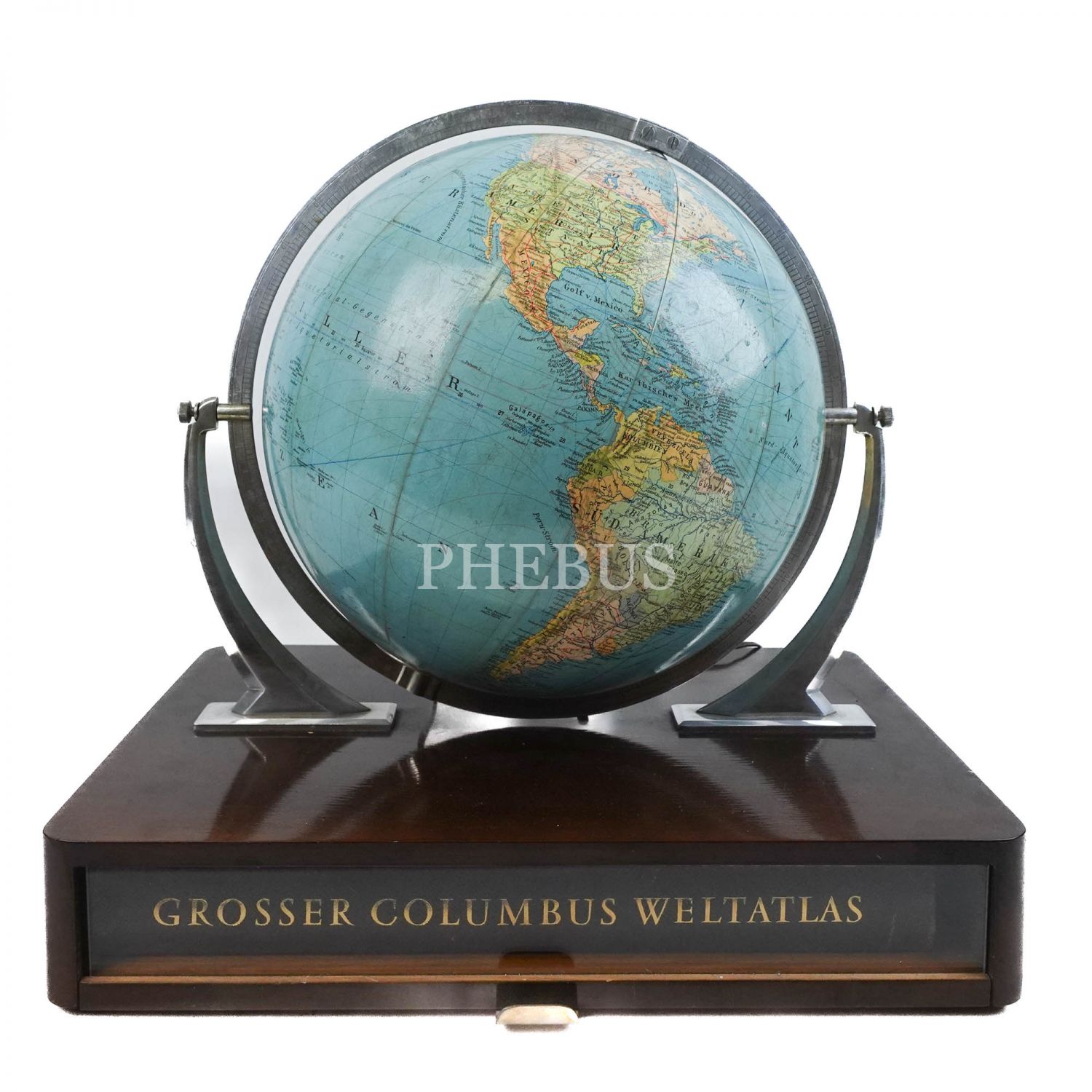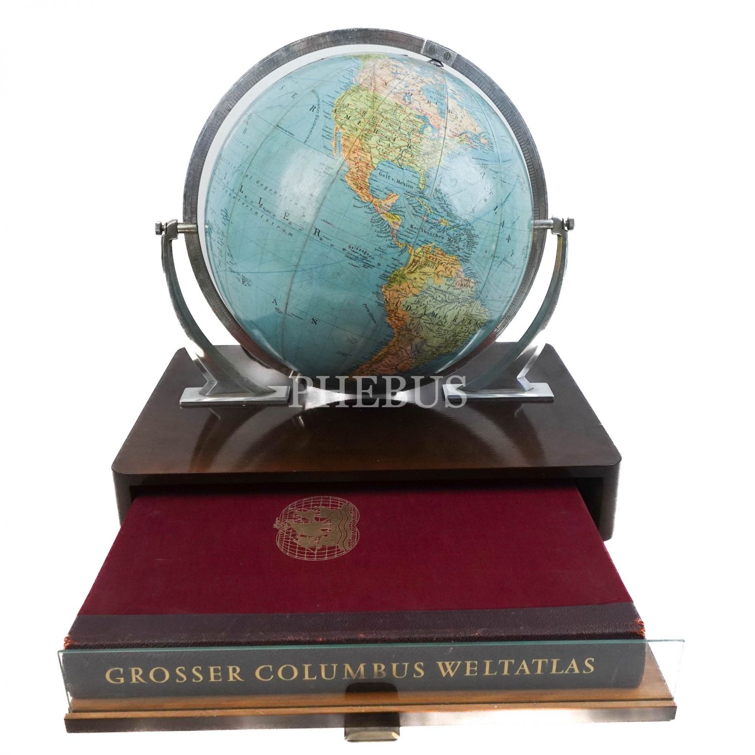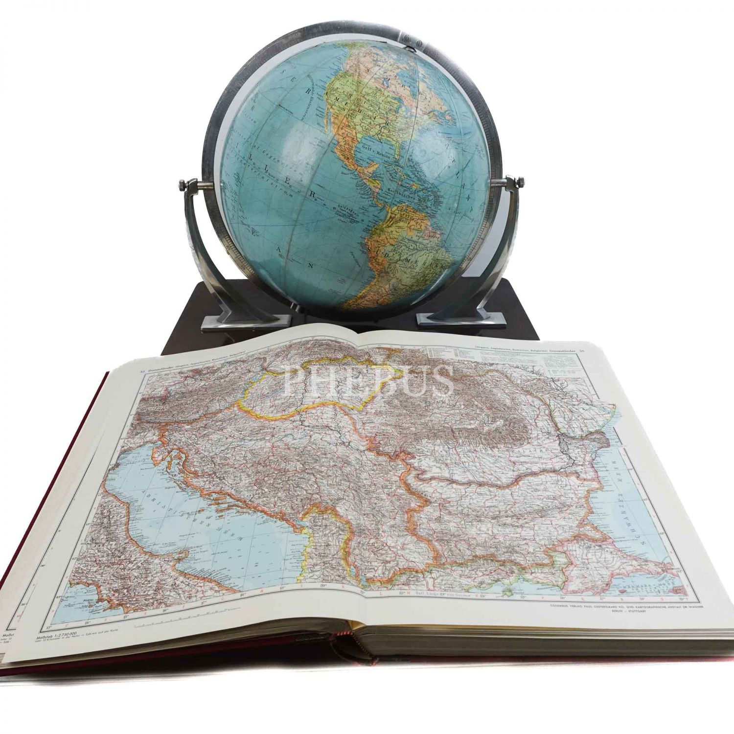 Üstünde ışıklı dünya küresi yer alan orijinal ahşap kutusunda GROSSER COLUMBUS WELTATLAS (E. Debes Handatlas), (yeniden düzenleyen: Karlheinz Wagner), 1961, Columbus Verlag Paul Oestergaard KG und Kartographische Anstalt Dr. Wagner, Berlin und Stuttgart/ Beutelsbach, 66 harita + alfabetik isim listesi, 30x42 cm...