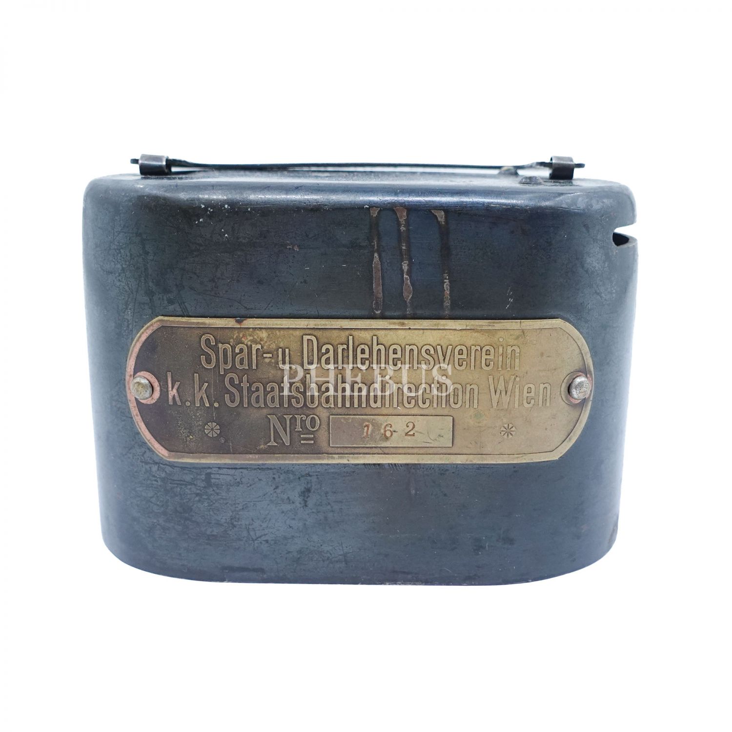 Viyana Devlet Demiryolu Müdürlüğü ibareli ve 162 numaralı Almanca plakasıyla çelik kumbara, 10x7,5x6 cm...