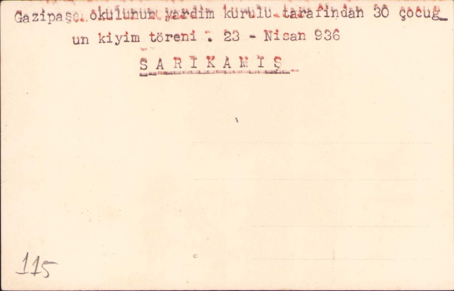 Kars Sarıkamış, Gazipaşa Okulunun yardım kurulu tarafından 30 çocuğun kıyım töreni, 23 Nisan 1936