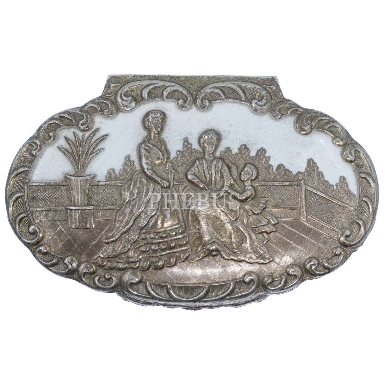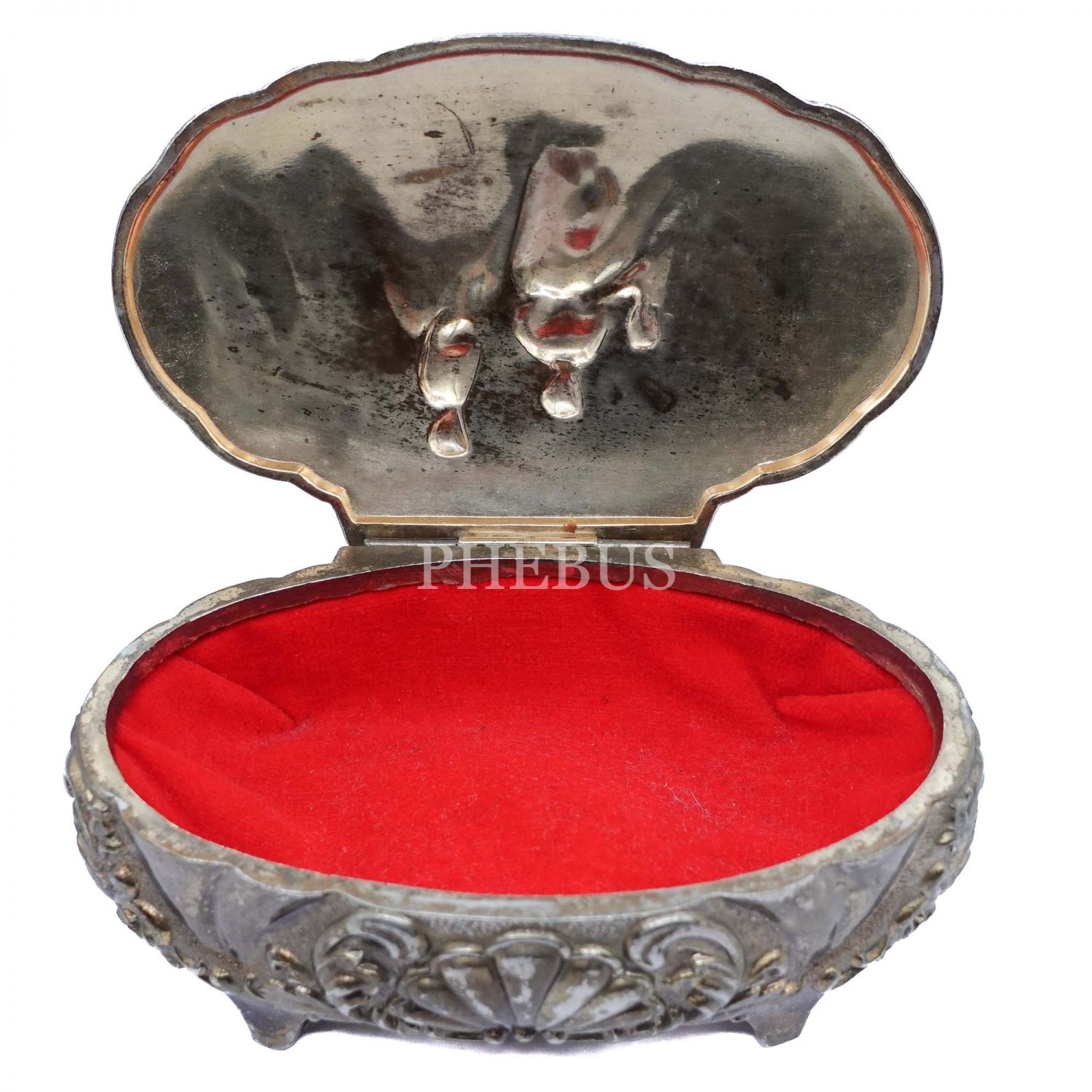 Alpaka mücevher kutusu, kapağı anne, baba ve çocuk figürlü, içi kadife kaplı, 12x8x4 cm...