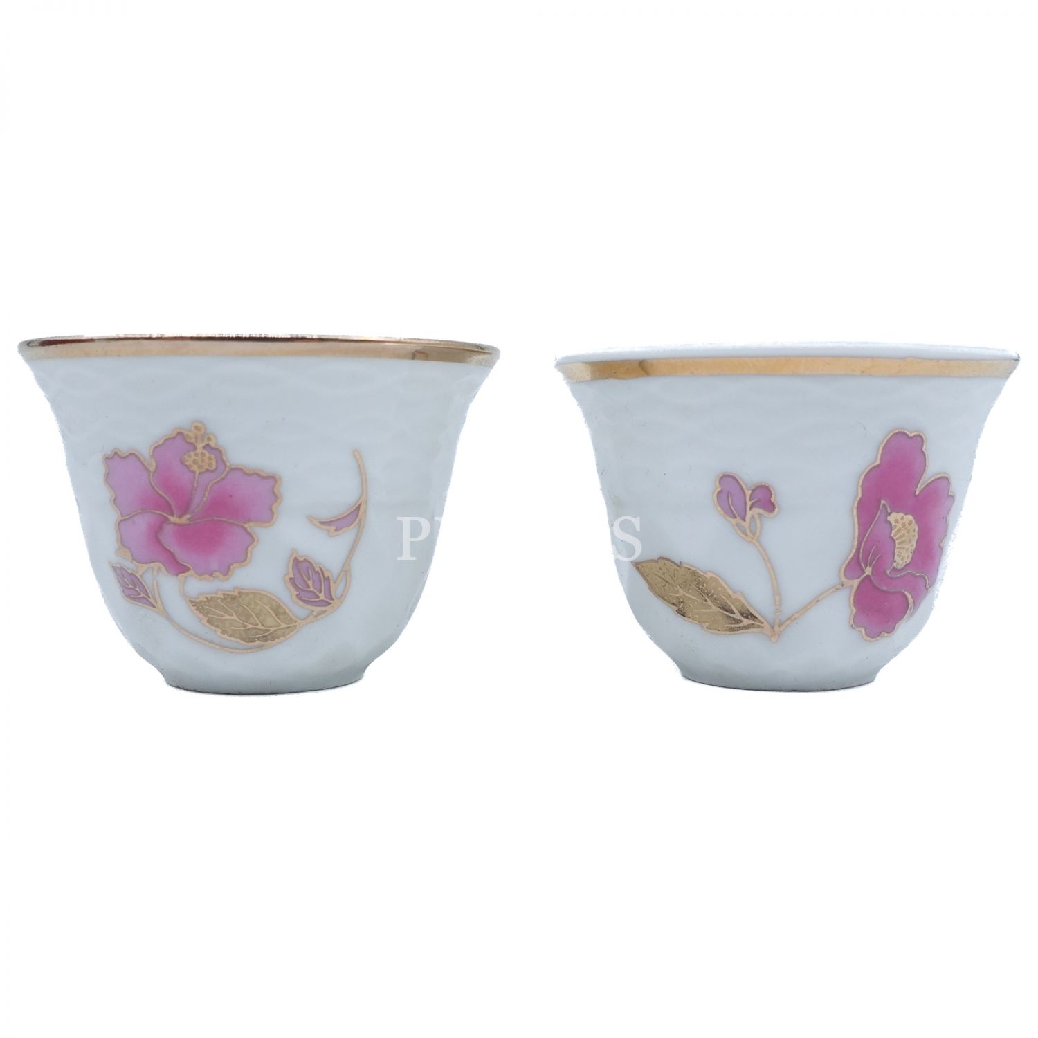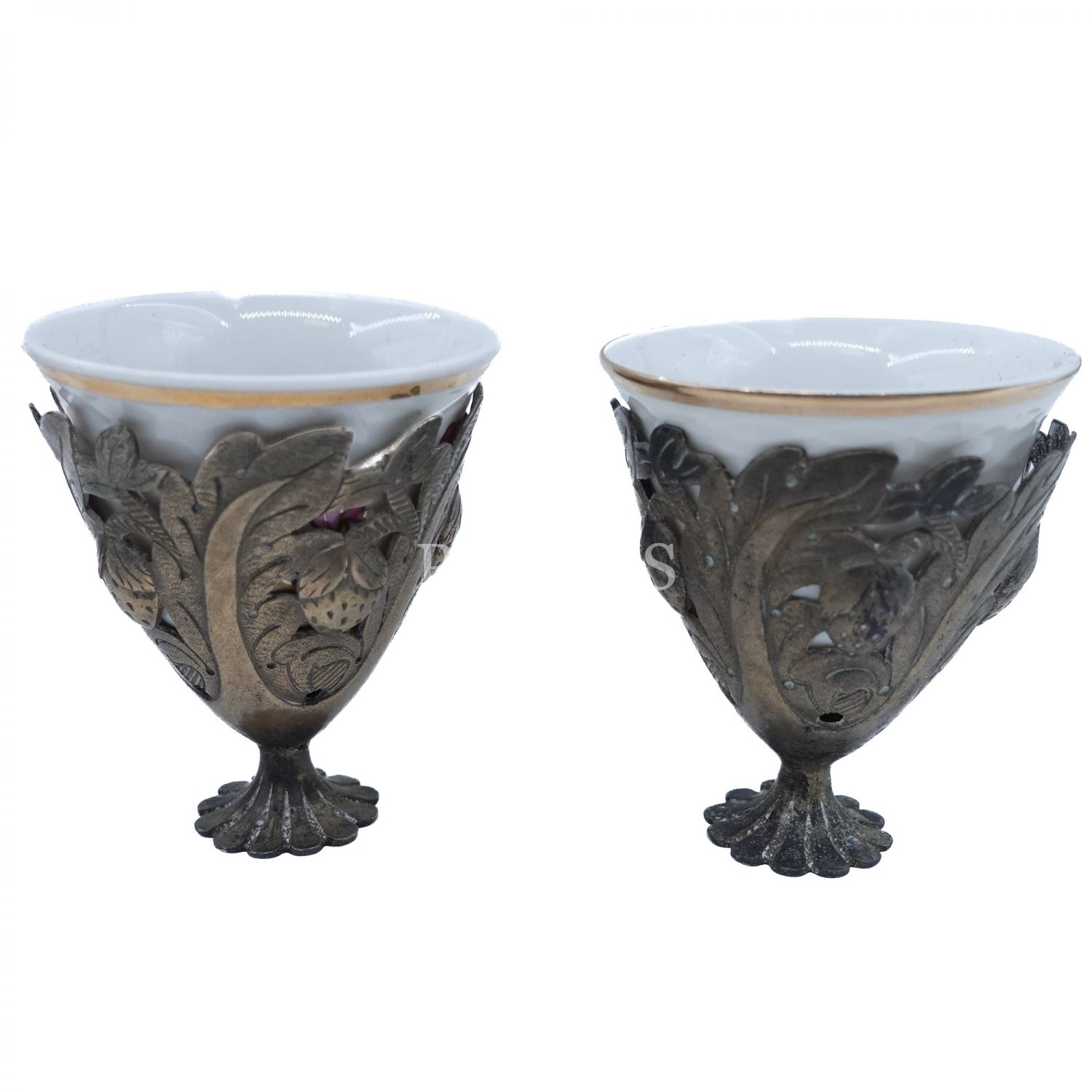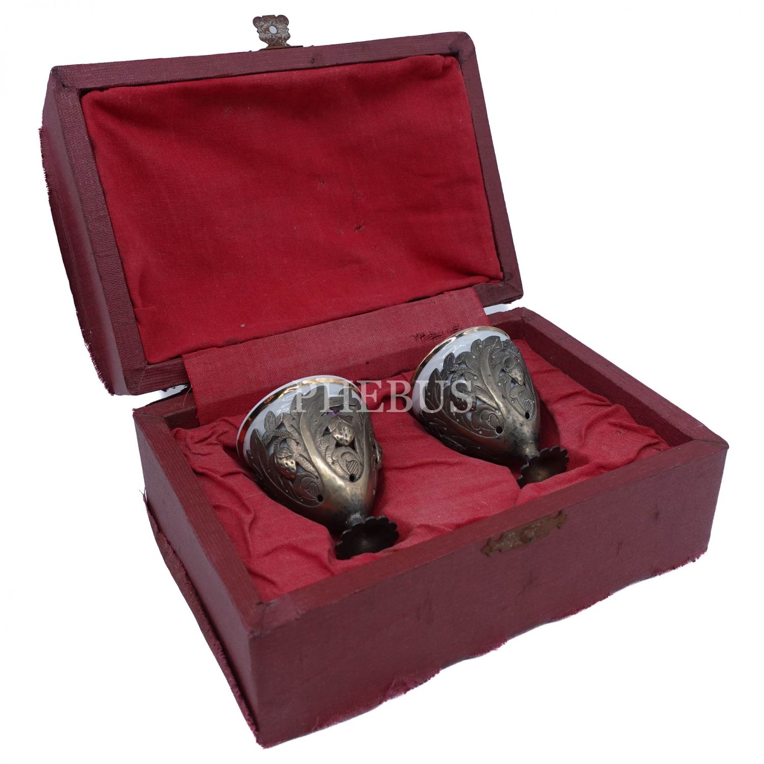 "Japan" damgalı bir çift el boyama çiçek motifli ve altın yaldız dekorlu fincan ve floral desenli gümüş zarfları, orijinal kutusunda, fincanlar (zarflarıyla birlikte) 6x5 cm...