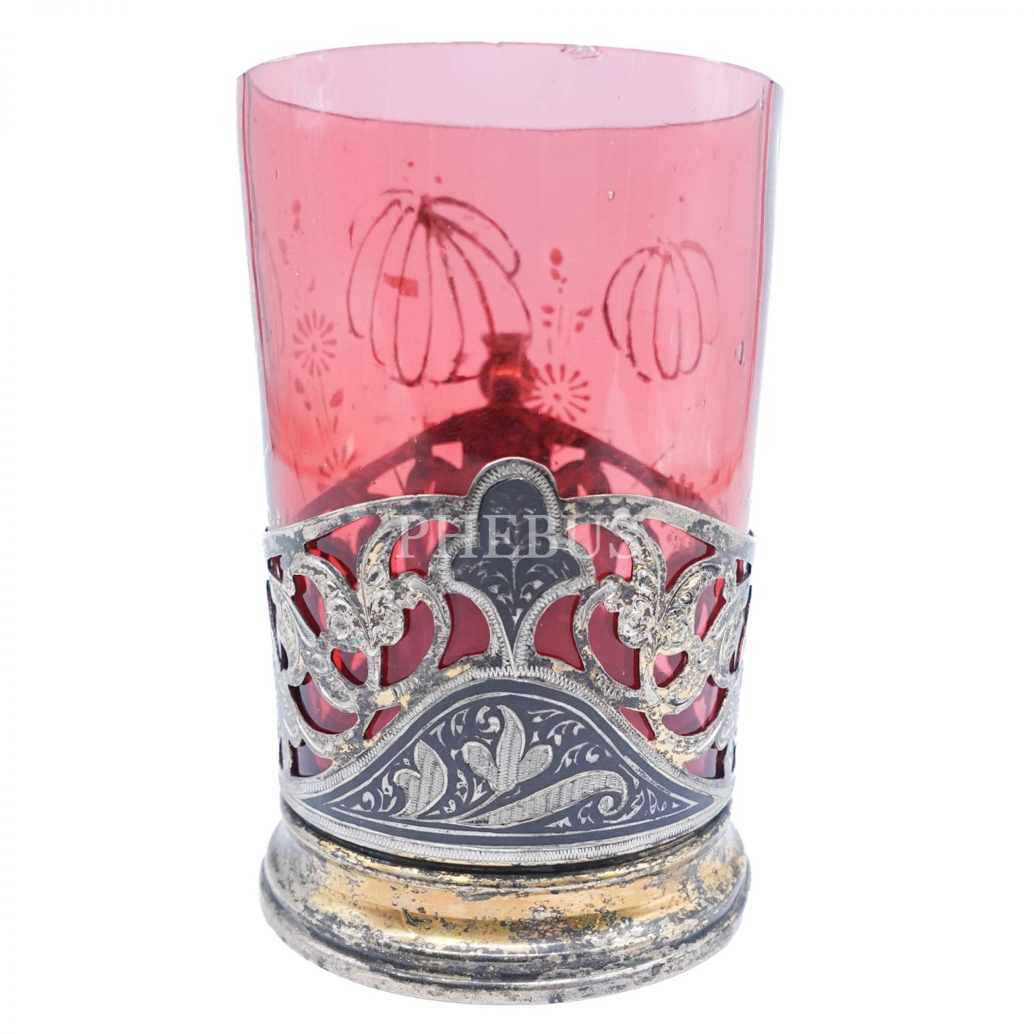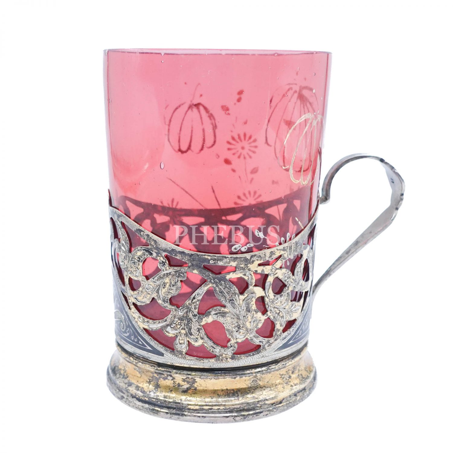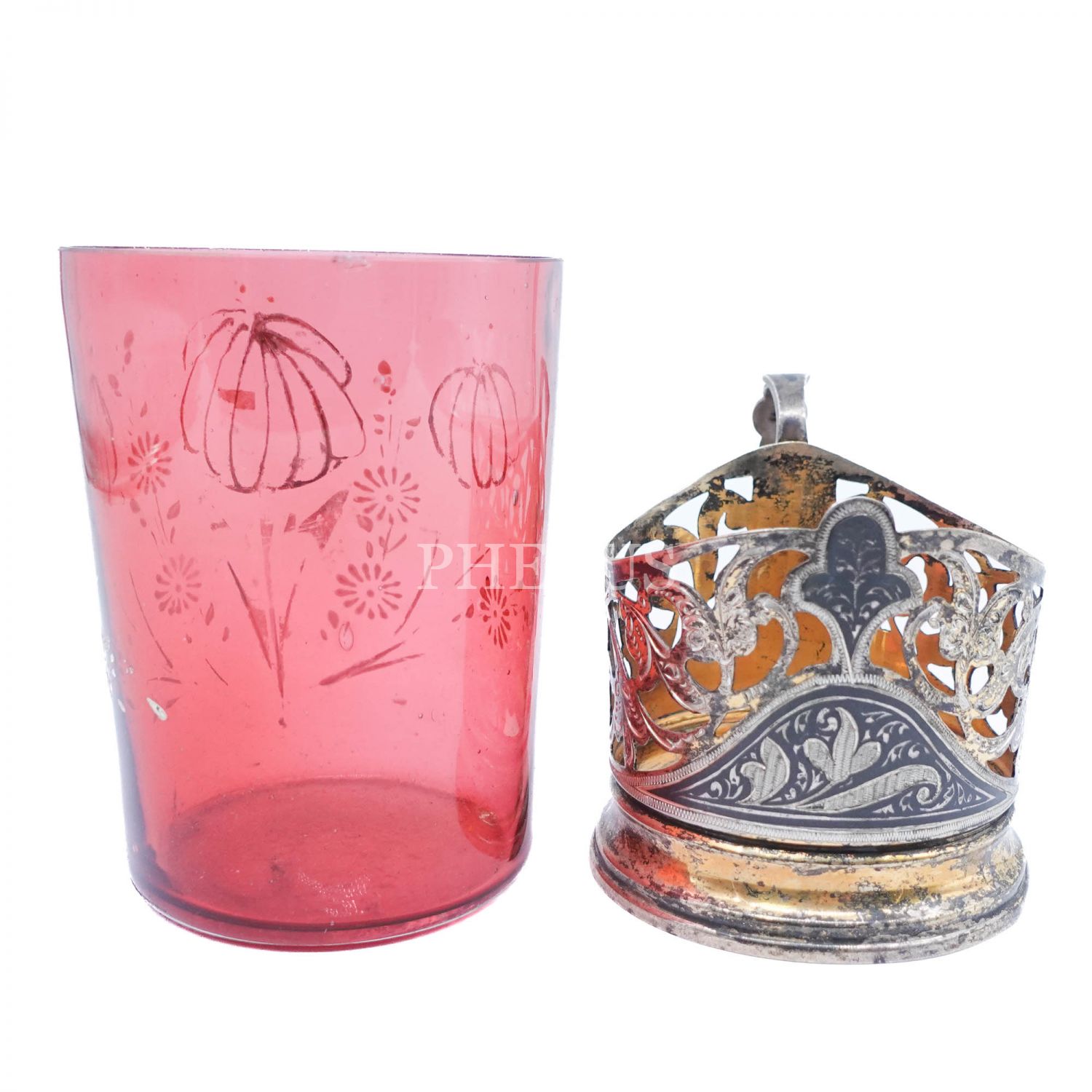 Osmanlıca usta ve ayar damgalı gümüş zarfında, üzeri el boyama floral desenlerle bezeli bardak, (zarfıyla birlikte) 11x7 cm...