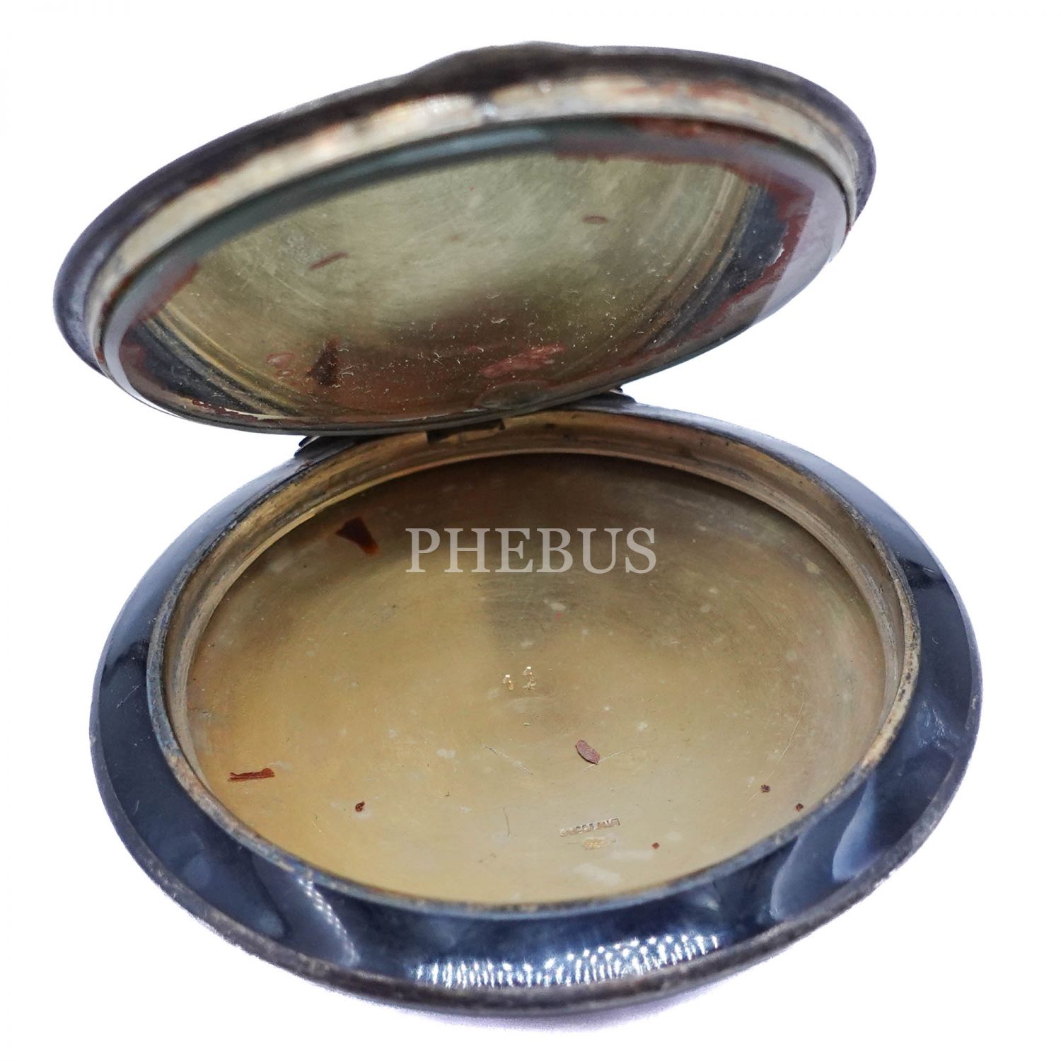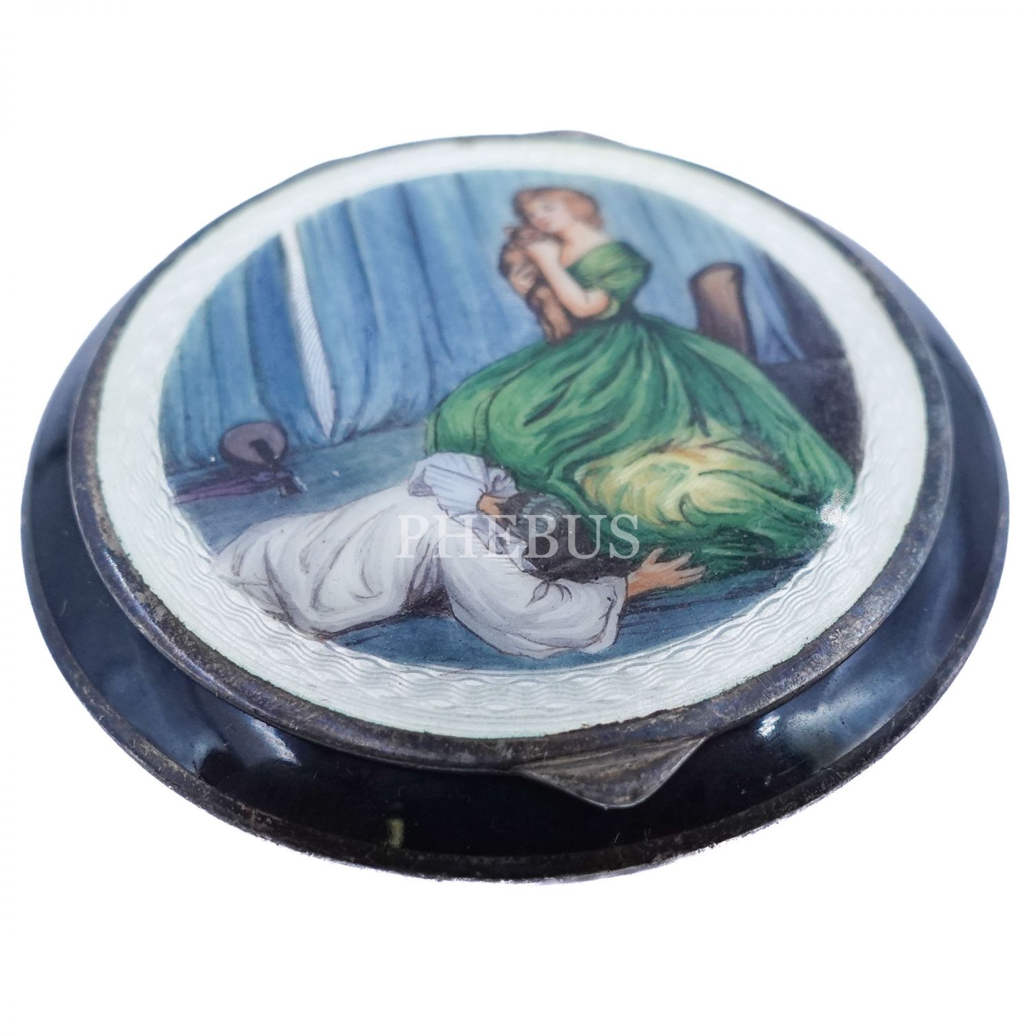 Siyah lake üzerine Viyana, gümüş mineli pudriyer, içi aynalı, kapağı Cindirella görselli, 63 g., çap 6 cm...
