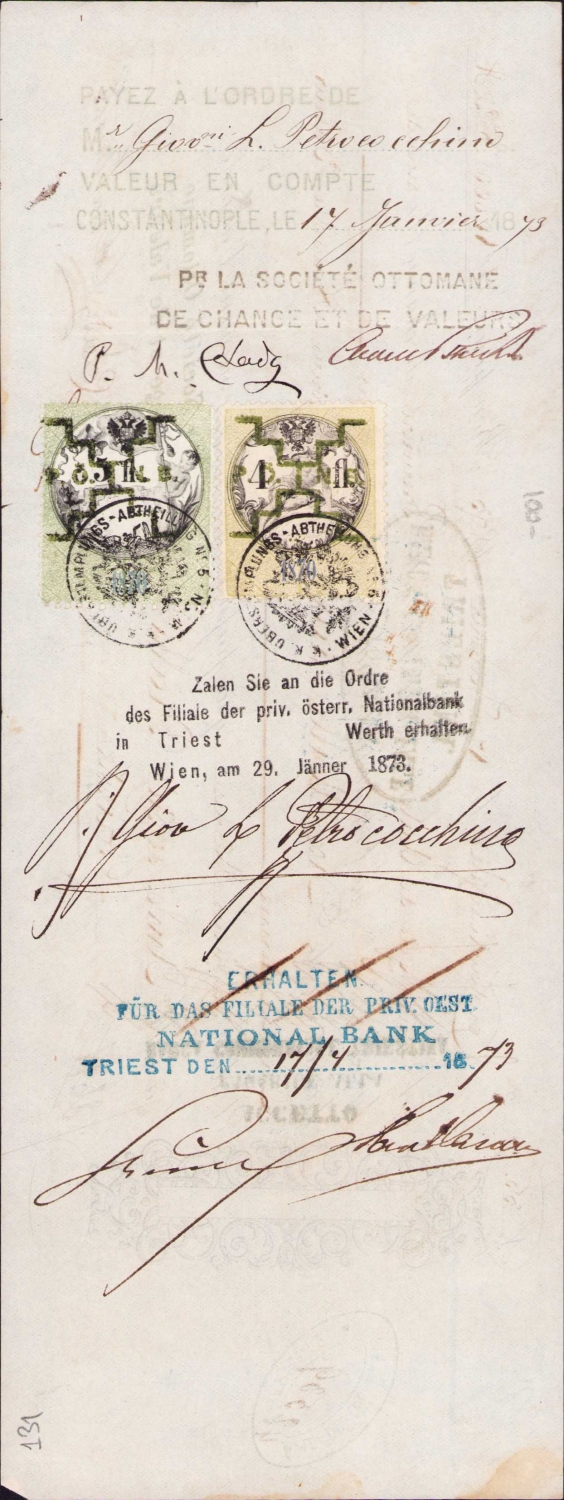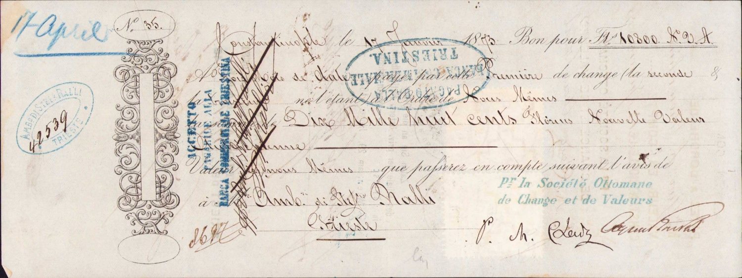 Fransızca çek, Pagato Dalla - Triestina damgalı, Constsntinople 1873, 27x10 cm