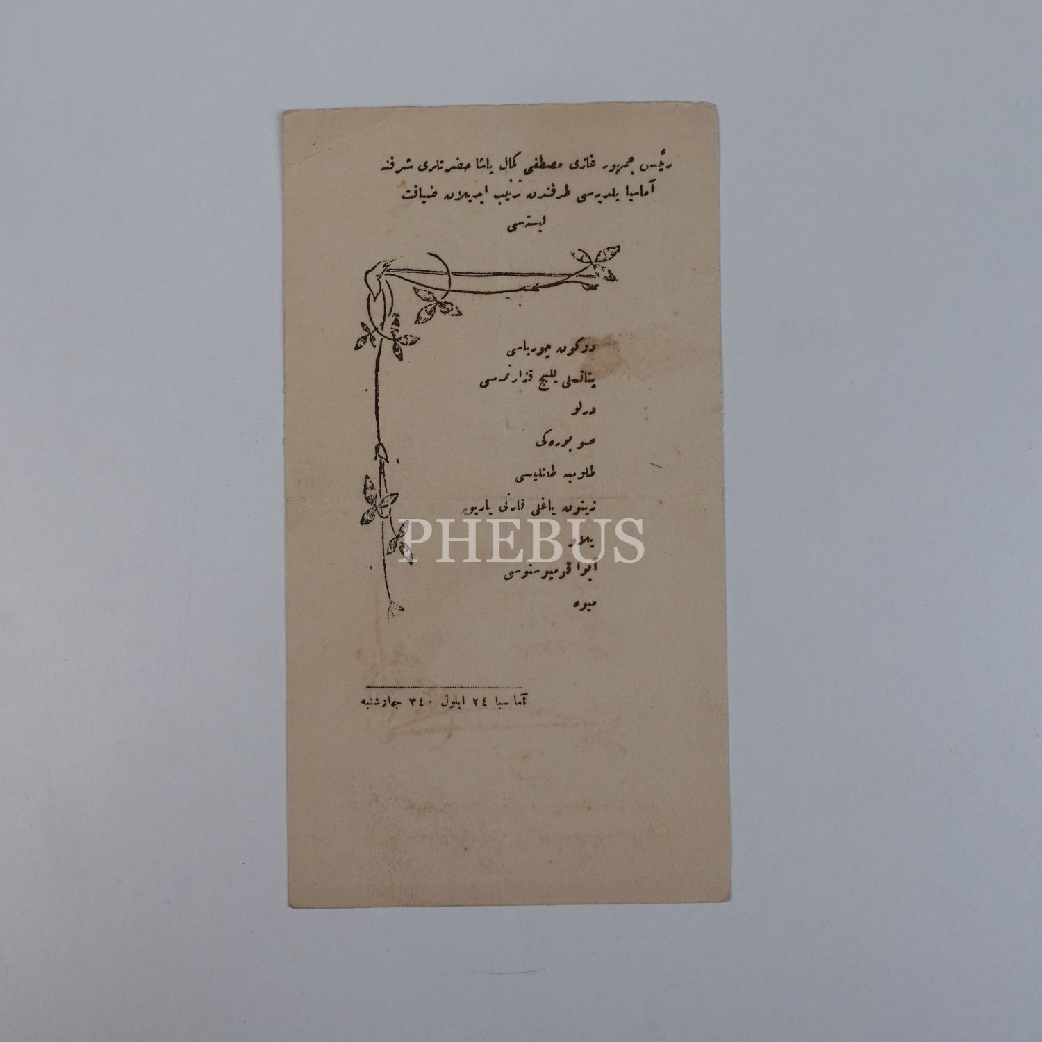 Mustafa Kemal Atatürk´ün 24 Eylül 1924 tarihinde Amasya´ya gerçekleştirdiği ziyaretinin şerefine, Amasya Belediyesi tarafından düzenlenen yemeğin menüsü, 12x21 cm...