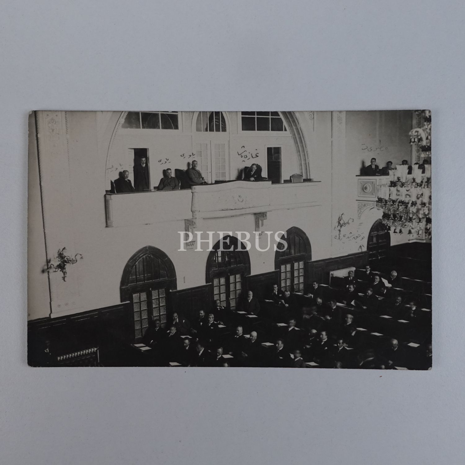 Fotoğrafın ön yüzüne, mecliste görülen belli başlı isimler not düşülmüştür. (Soldan sağa): "Yaveri - Yaveri - Yaveri - Gazi Paşa - Matbuat - Tevfik Rüşdi (Aras) Bey" Fotoğrafın arka yüzüne ise "İkbal?" Hanım´a hitaben, "Yeni Meclis Binası - Çok güzel ve çok mükemmel bir binadır. Matbuatın diye gösterdiğim locanın yanı başındaki loca da Sâmi´nin locasıdır. Teşrinisani birde o locada idik... Gaziyi o locadan güzelce gördük..." notu düşülmüştür.