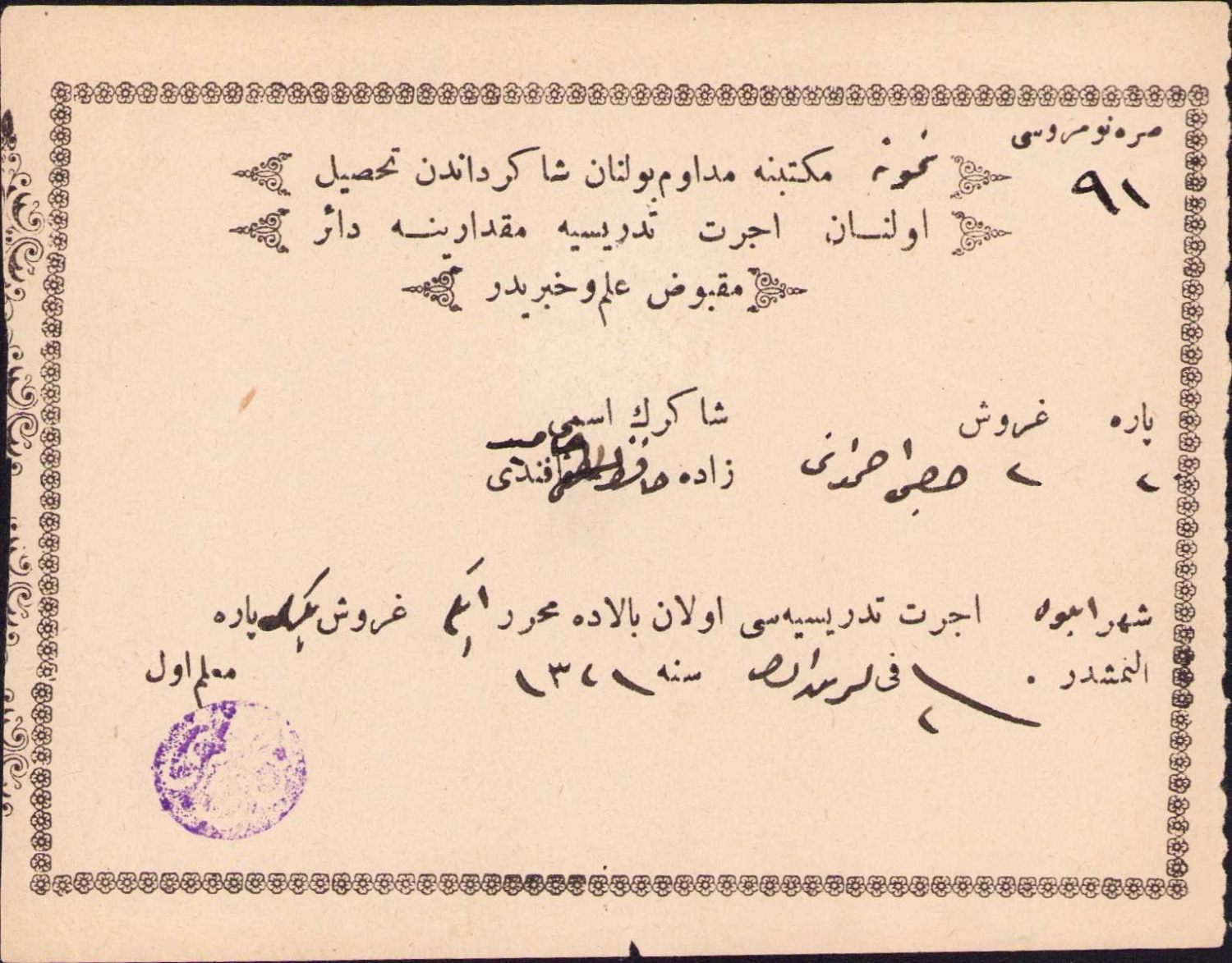 Osmanlıca Numune Mektebine müdavim bulunan şakirdaneden tahsil olunan ücret tedrisi miktarına dair makbuz ilmuhaberi, 12x9 cm