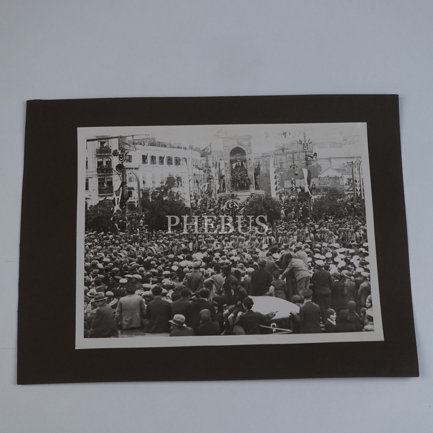 Cumhuriyet´in ilanının 10. yıldönümüne özel olarak bayraklarla donatılmış Taksim Meydanı´nı hıncahınç dolduran halkın arasından Şişli istikametine doğru yürüyüş yapan askerler, sağ arka tarafta 10 Kasım 1932 tarihinde gösterime giren ABD yapımı "Ben Bir Pranga Kaçağıyım" (I Am a Fugitive from a Chain Gang) filminin reklam panosu göze çarpmaktadır, 24x18 cm...
