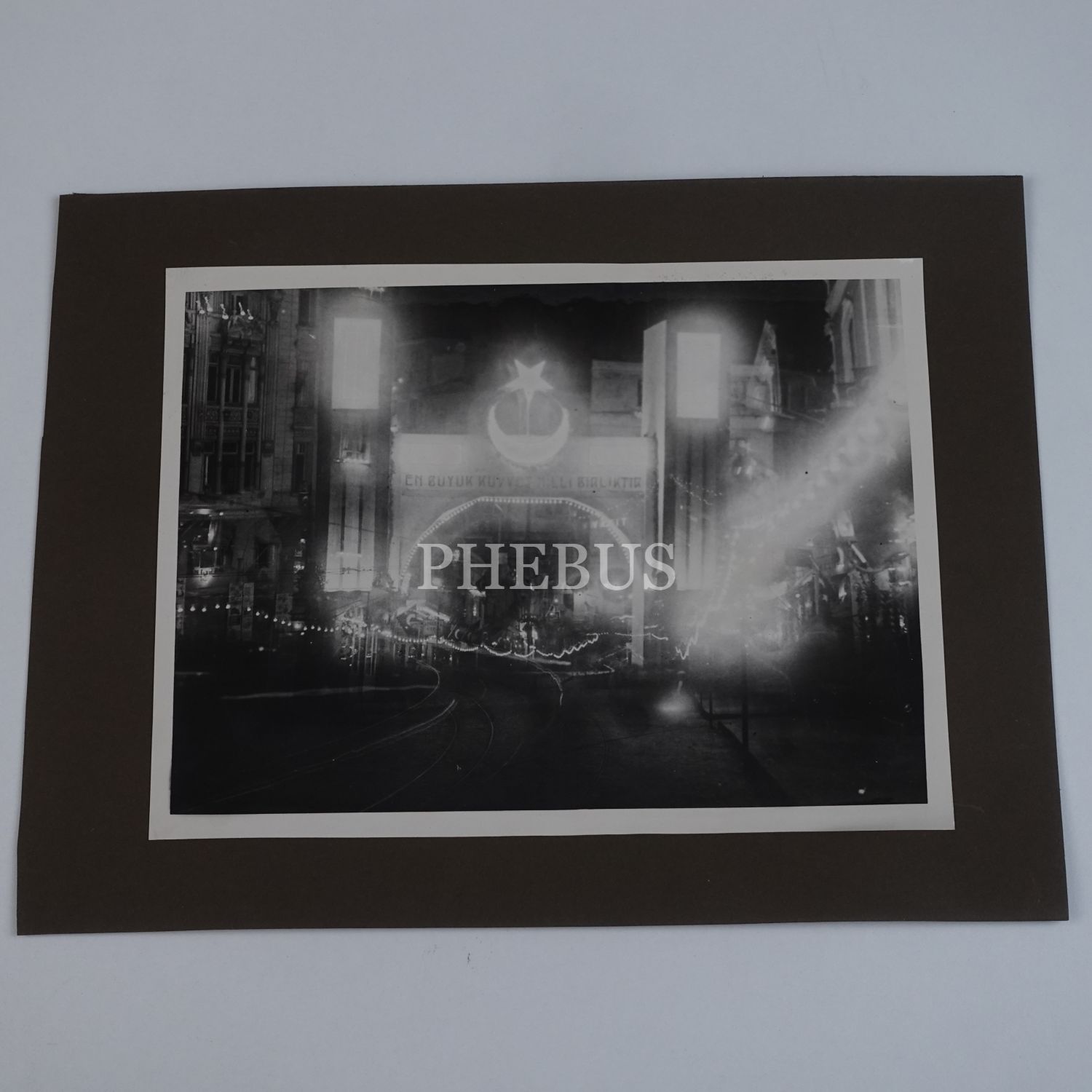 Cumhuriyet´in ilanının 10. yıldönümüne özel olarak İstiklal Caddesi´ne kurulan, "En Büyük Kuvvet Millî Birliktir!" yazılı ve ay-yıldız motifli ışıklı tak, 24x18 cm...