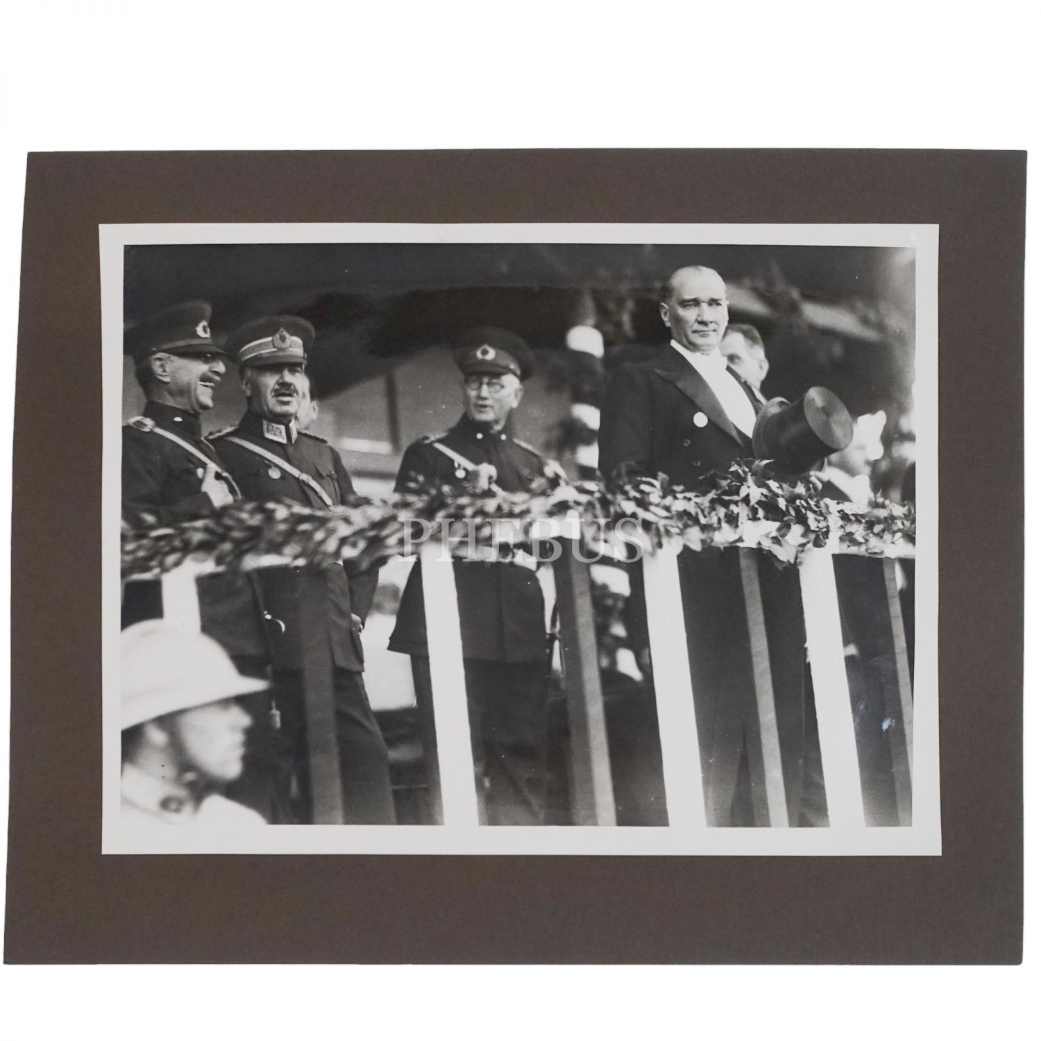 Mustafa Kemal Atatürk ve Fevzi Çakmak, Ankara Hipodromu´nda düzenlenen 10. Yıl törenlerinde, Türk ordusunun geçit merasimini izliyor, 24x18 cm...