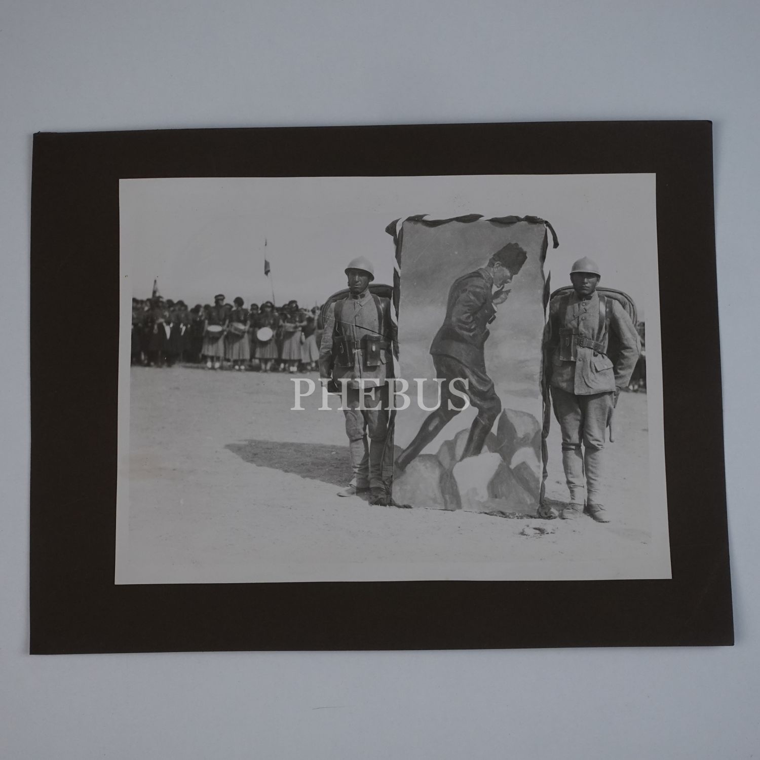 Ankara Hipodromu´nda düzenlenen 10. Yıl törenlerinde, meydana kondurulmuş Mustafa Kemal Atatürk heykeli ile Anadolu medeniyetlerinin izlerini taşıyan bir başka heykelin yan yana görüldüğü enstantane fotoğraf, 24x18 cm...
