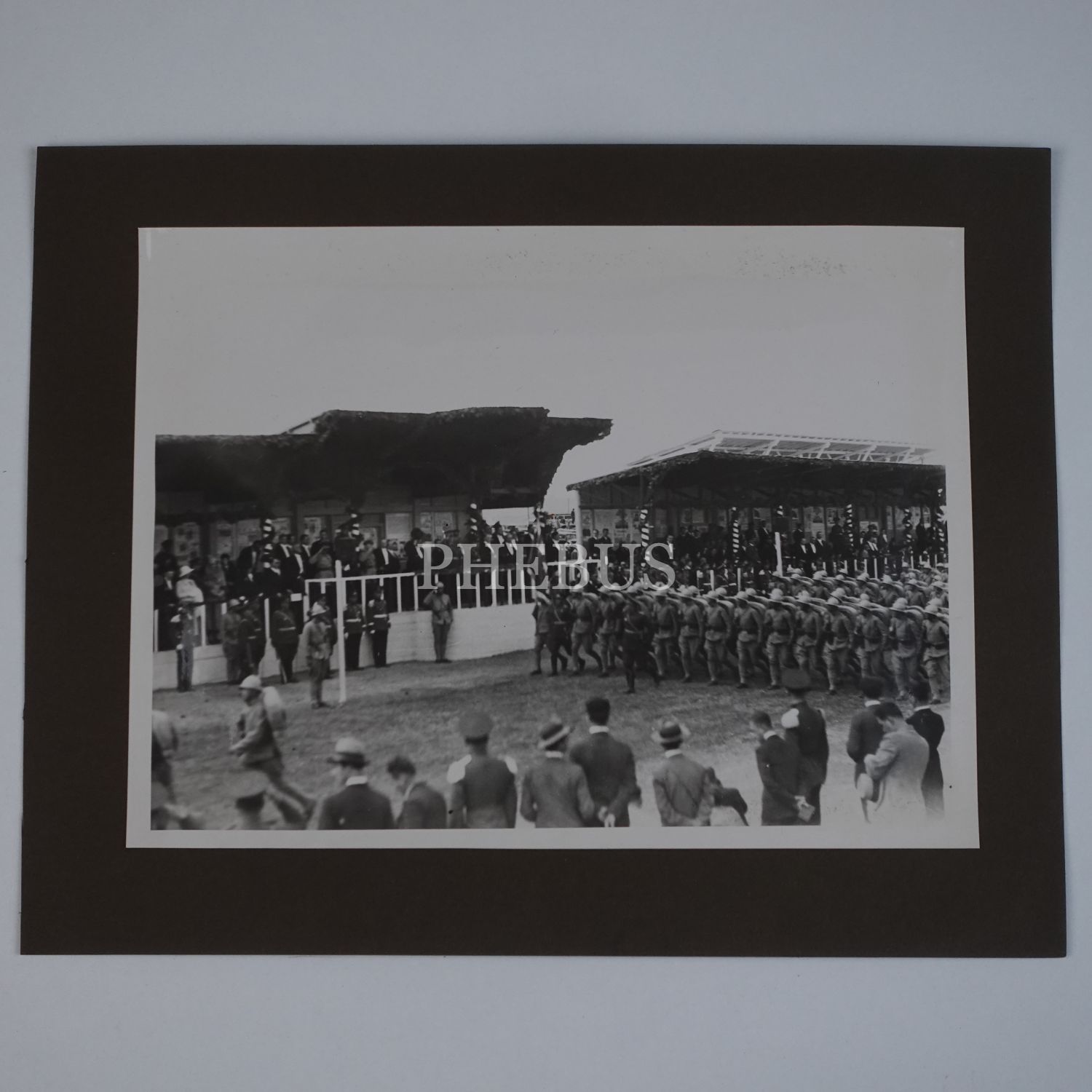 Ankara Hipodromu´nda düzenlenen 10. Yıl törenlerinde, Mustafa Kemal Atatürk´ün bulunduğu protokolün önünden geçen Türk piyadeleri, 24x18 cm...