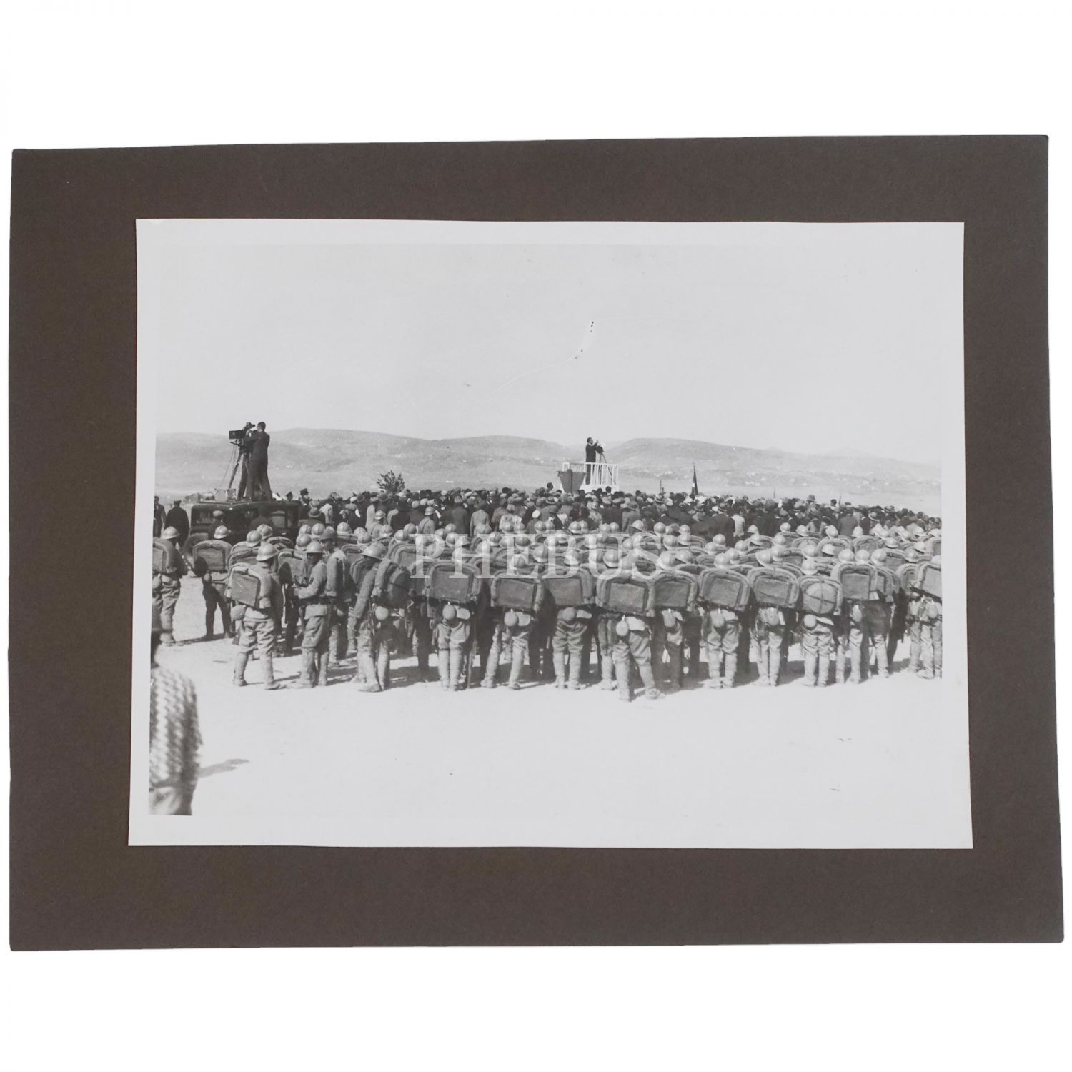 Ankara Hipodromu´nda düzenlenen 10. Yıl törenlerinde, meydana kurulmuş platform üzerinden halka ve askerlere hitaben nutuk irat eden bir beyefendi, sol tarafta çekim yapan bir kameraman görülmektedir, 24x18 cm...