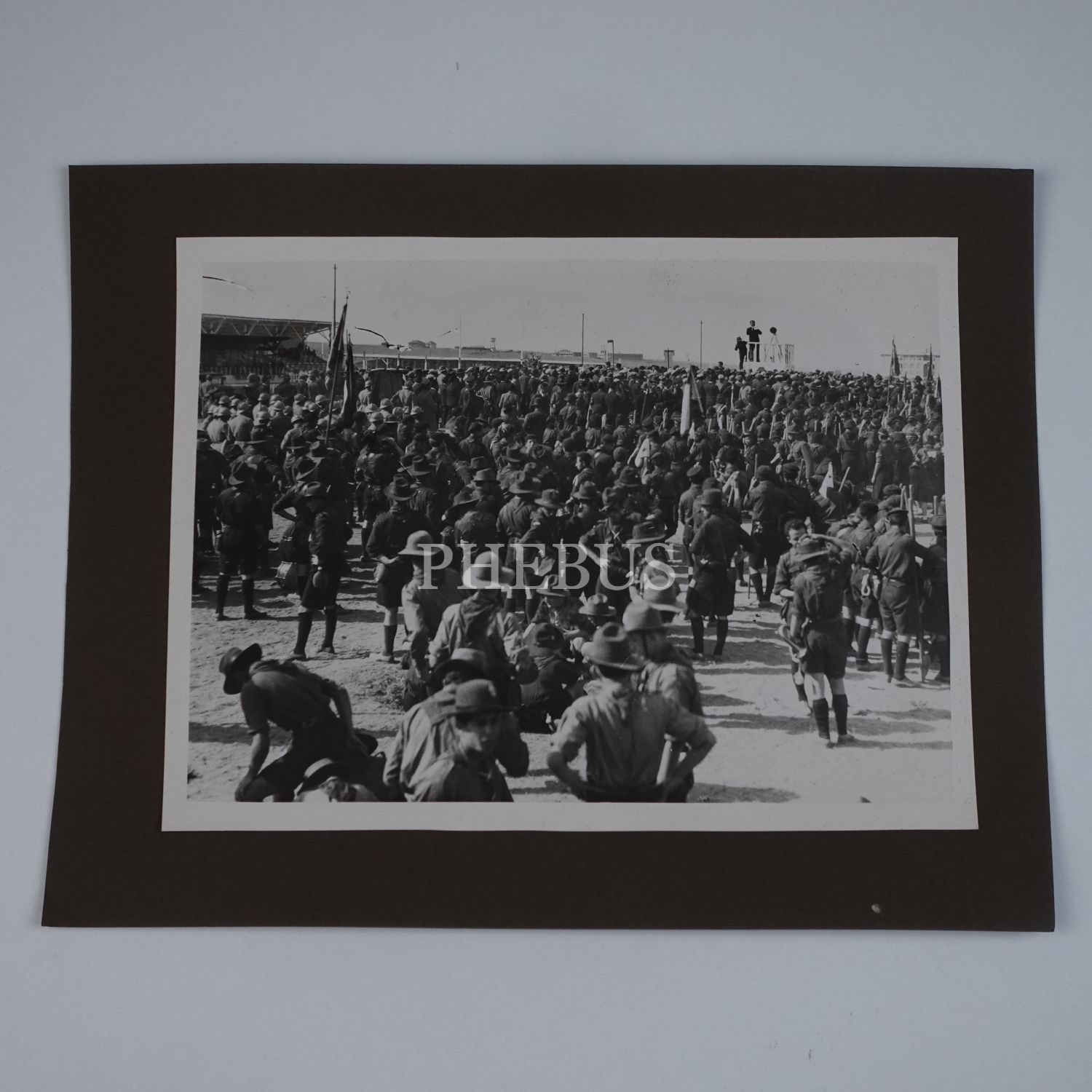 Ankara Hipodromu´nda düzenlenen 10. Yıl törenlerinde, meydana kurulmuş platform üzerinden halka hitaben nutuk irat eden bir beyefendi, ön tarafta merasim için hazırlanan izci öğrenciler görülmektedir, 24x18 cm...