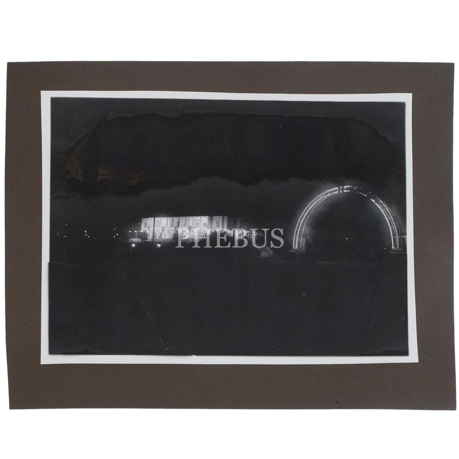 Cumhuriyet´in ilanının 10. yıldönümüne özel olarak Türk bayraklarıyla süslenmiş ve girişine ışıklı tak kurulmuş bir kamu binası, 24x18 cm...