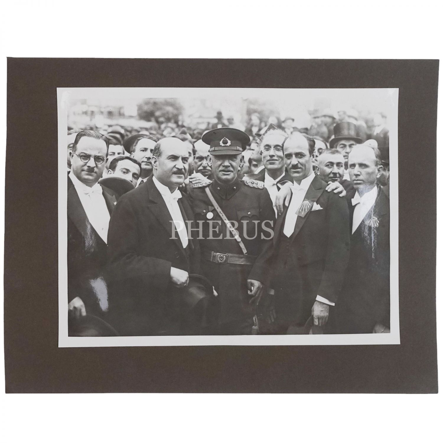 İstanbul Valisi Muhittin Memduh Üstündağ, üniformasına İstiklal Madalyası takılı bir general ve yakalarına Altı Ok simgeli kâğıt bayrak takmış görevlilerin 10. Yıl hatırası, 24x18 cm...