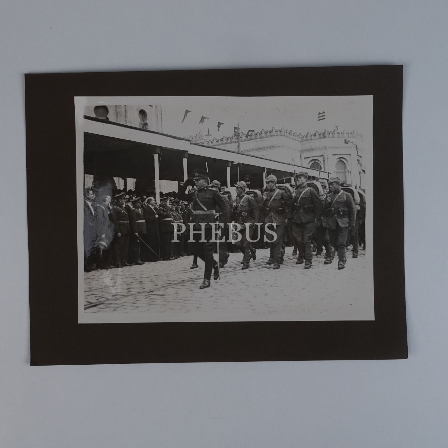 İstanbul´da düzenlenen 10. Yıl törenlerinde, İstanbul Valisi Muhittin Memduh Üstündağ´ın bulunduğu protokolün önünden geçen Türk piyadeleri, 24x18 cm...