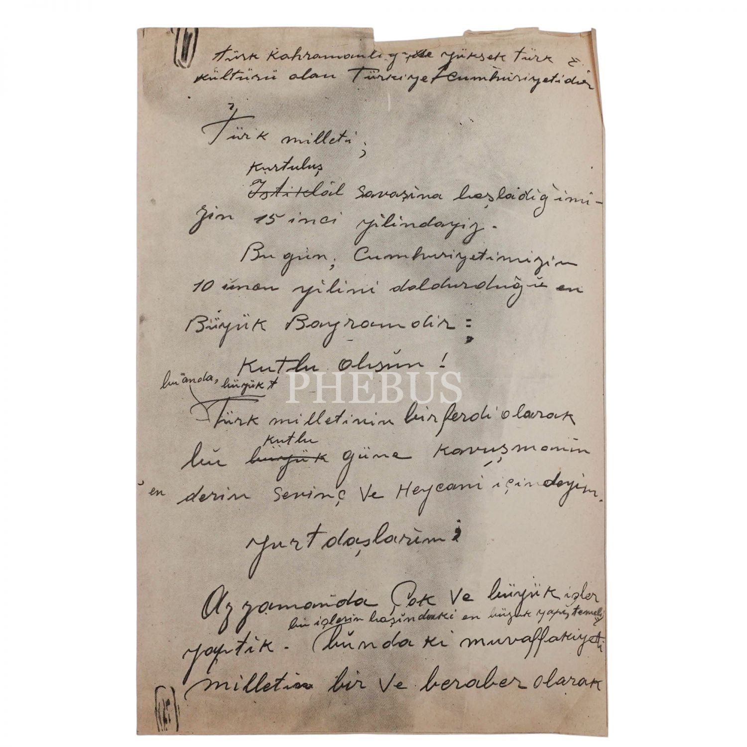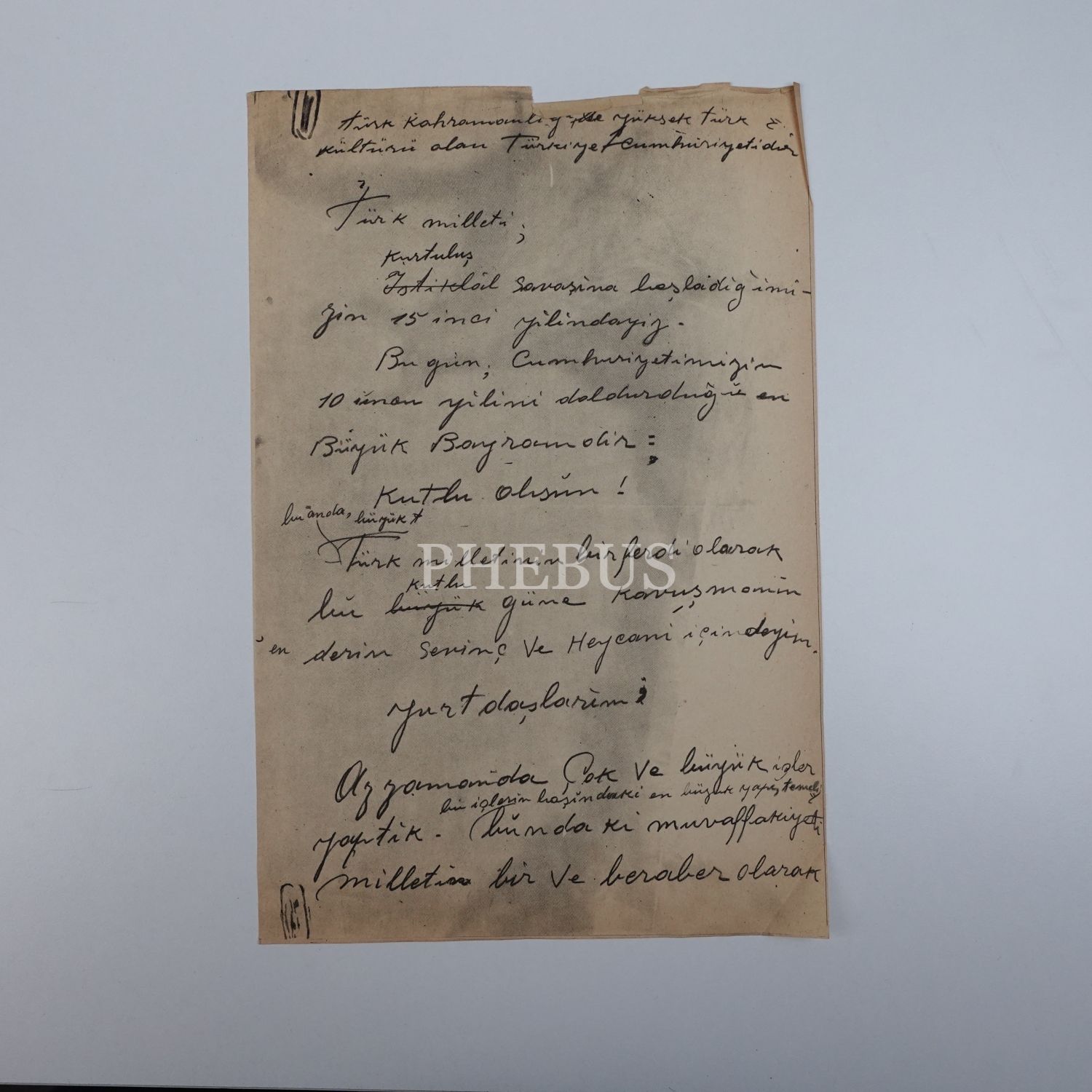 "Bugün Cumhuriyetimizin onuncu yılını doldurduğu en büyük bayramdır. Kutlu olsun!"