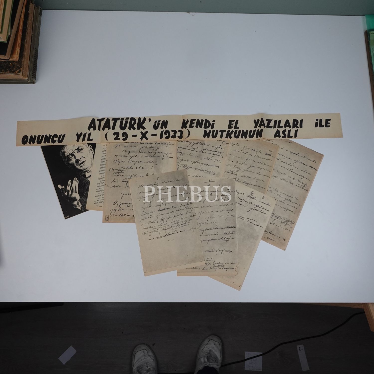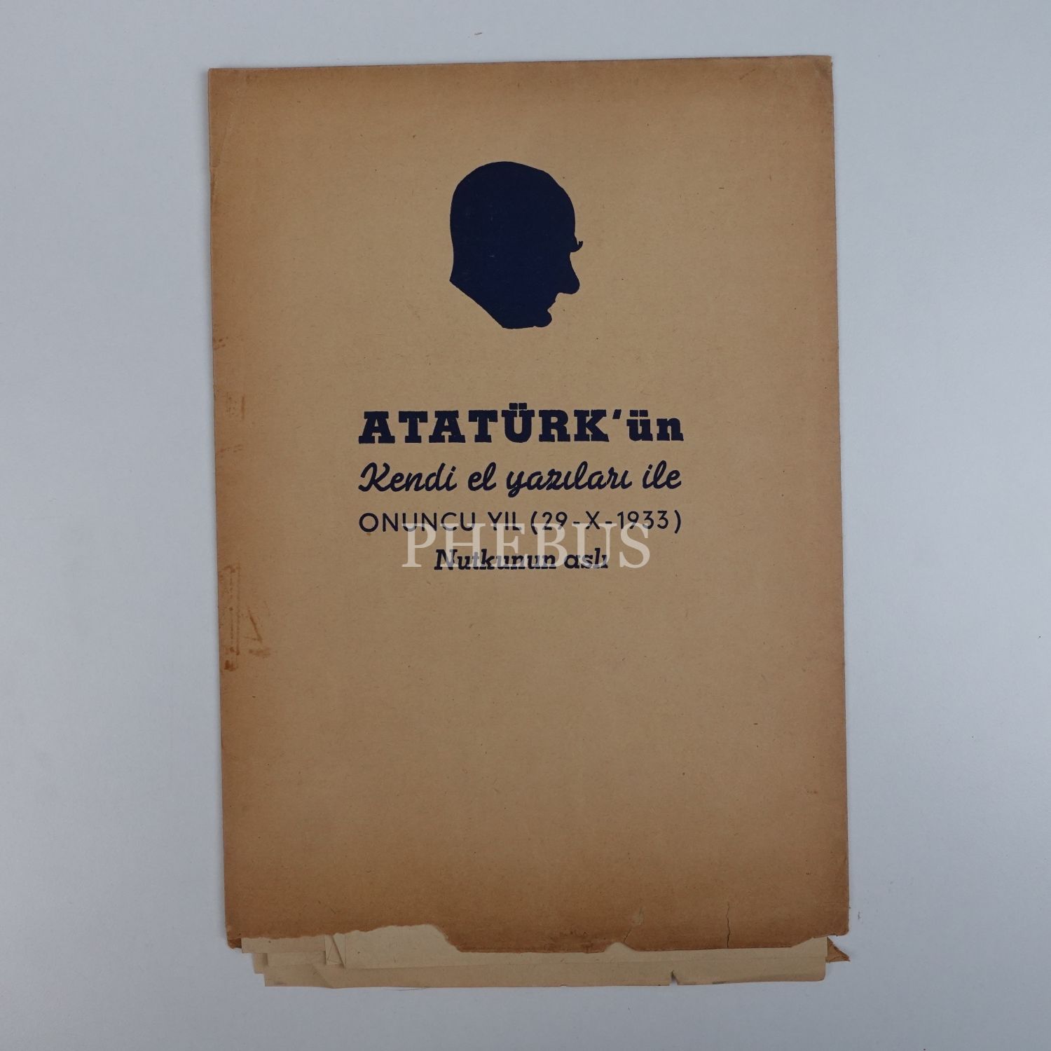 ATATÜRK´ÜN KENDİ EL YAZILARI İLE ONUNCU YIL (29-X-1933) NUTKUNUN ASLI, 7 sayfalık tıpkıbasım, nutkun daktilo metni, müellif-muharrir Cemal Kutay´ın sunuş yazısı ve eserin isminin yazılı olduğu 100x8 cm boyutundaki kuşak ile... 23x32 cm...