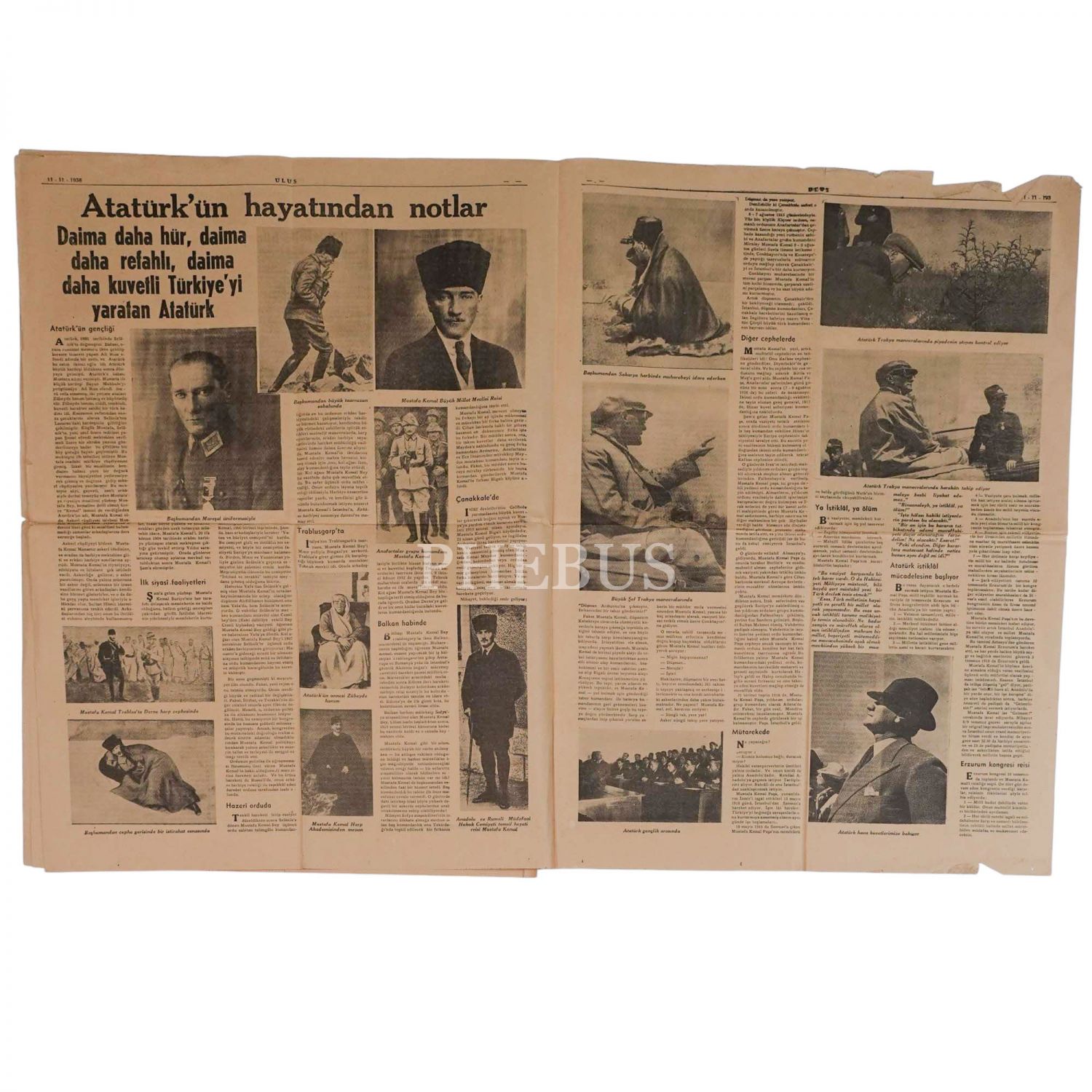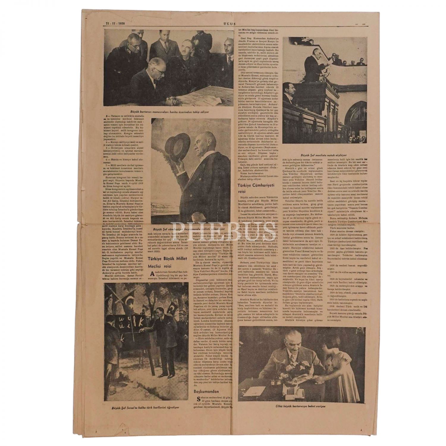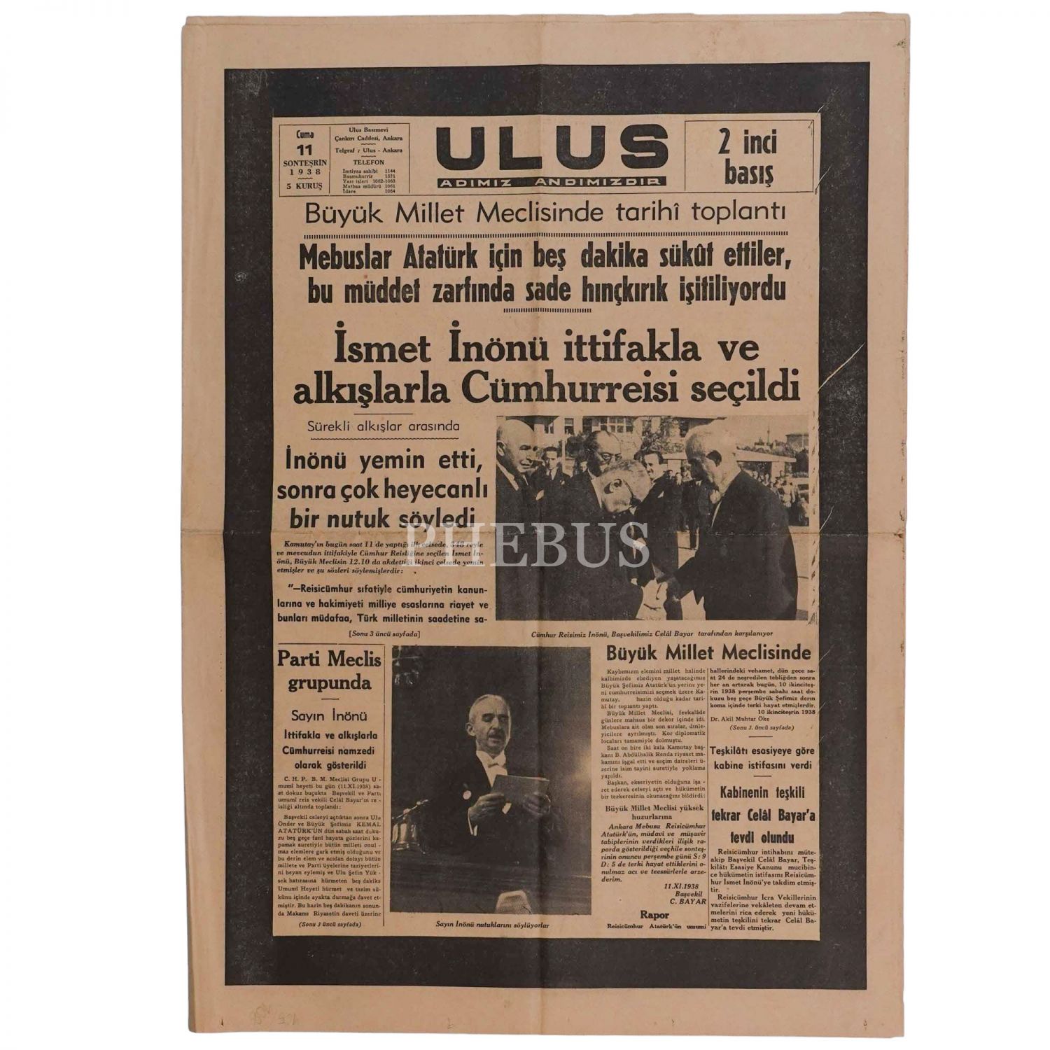 "İsmet İnönü İttifakla ve Alkışlarla Cümhurreisi Seçildi" manşetiyle, Mustafa Kemal Atatürk´ün vefatı sonrası İsmet İnönü´nün Cumhurbaşkanı seçilmesini duyuran ULUS gazetesi, 11 Sonteşrin (Kasım) 1938, 8 sayfa, 42x60 cm...