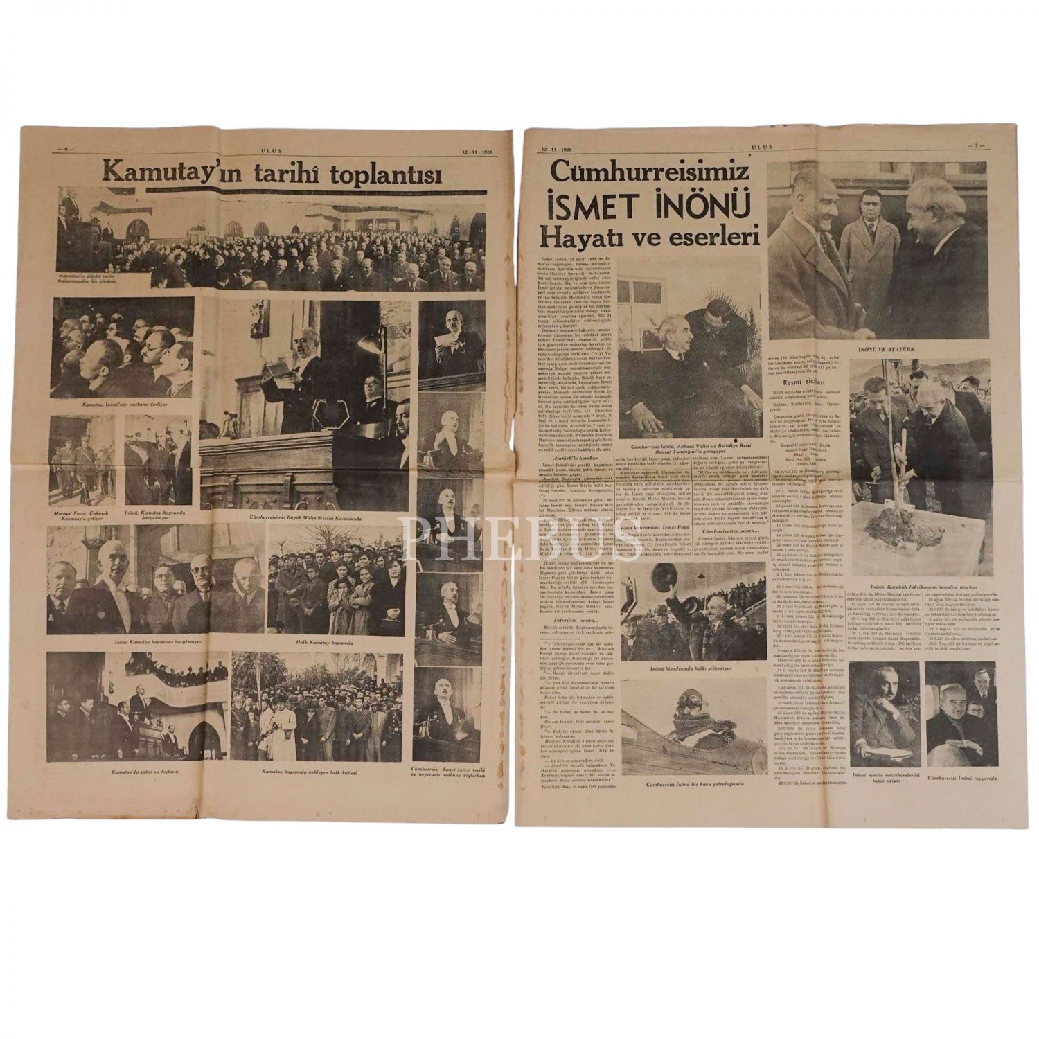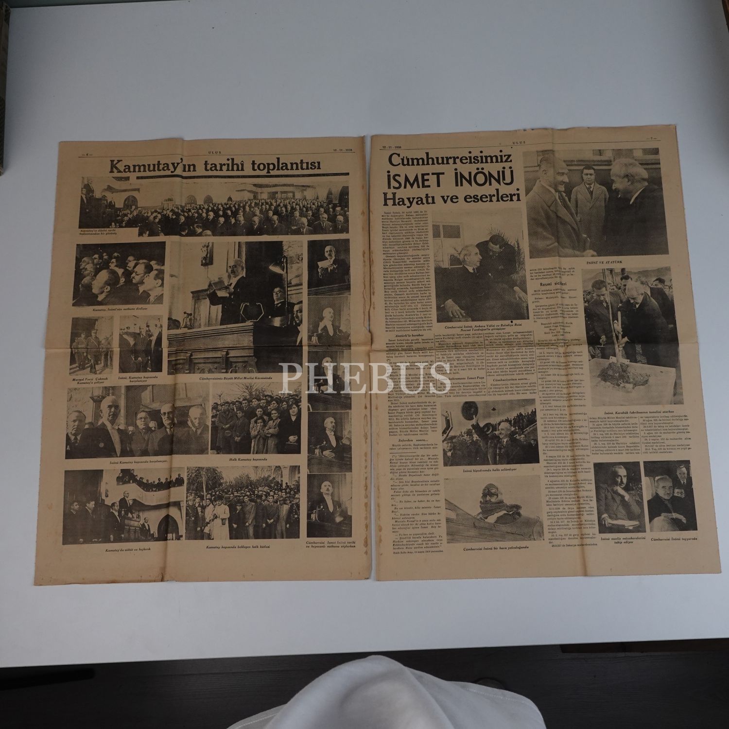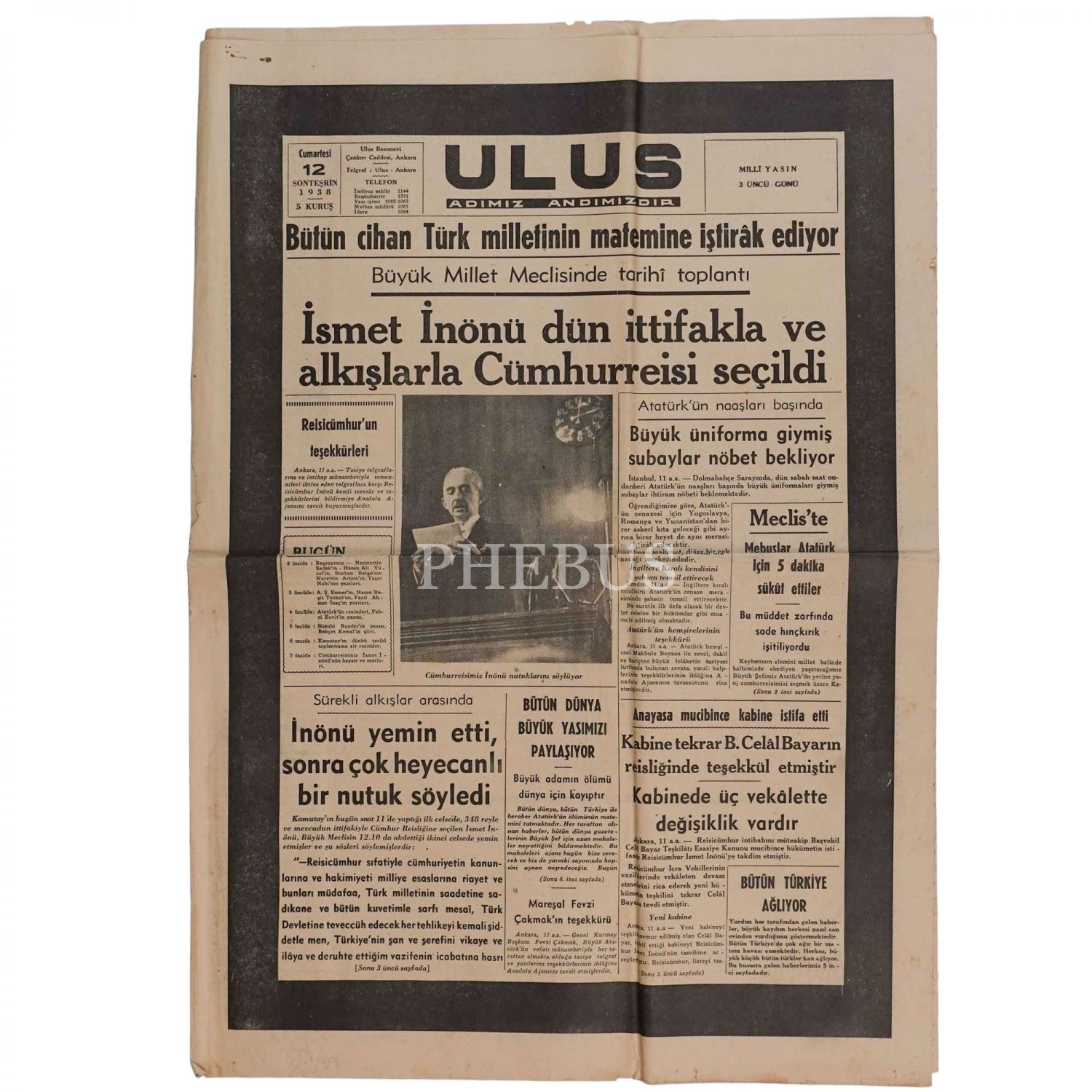 "İsmet İnönü İttifakla ve Alkışlarla Cümhurreisi Seçildi" manşetiyle, Mustafa Kemal Atatürk´ün vefatı sonrası İsmet İnönü´nün Cumhurbaşkanı seçilmesini duyuran ULUS gazetesi, 12 Sonteşrin (Kasım) 1938, 12 sayfa, 42x60 cm...