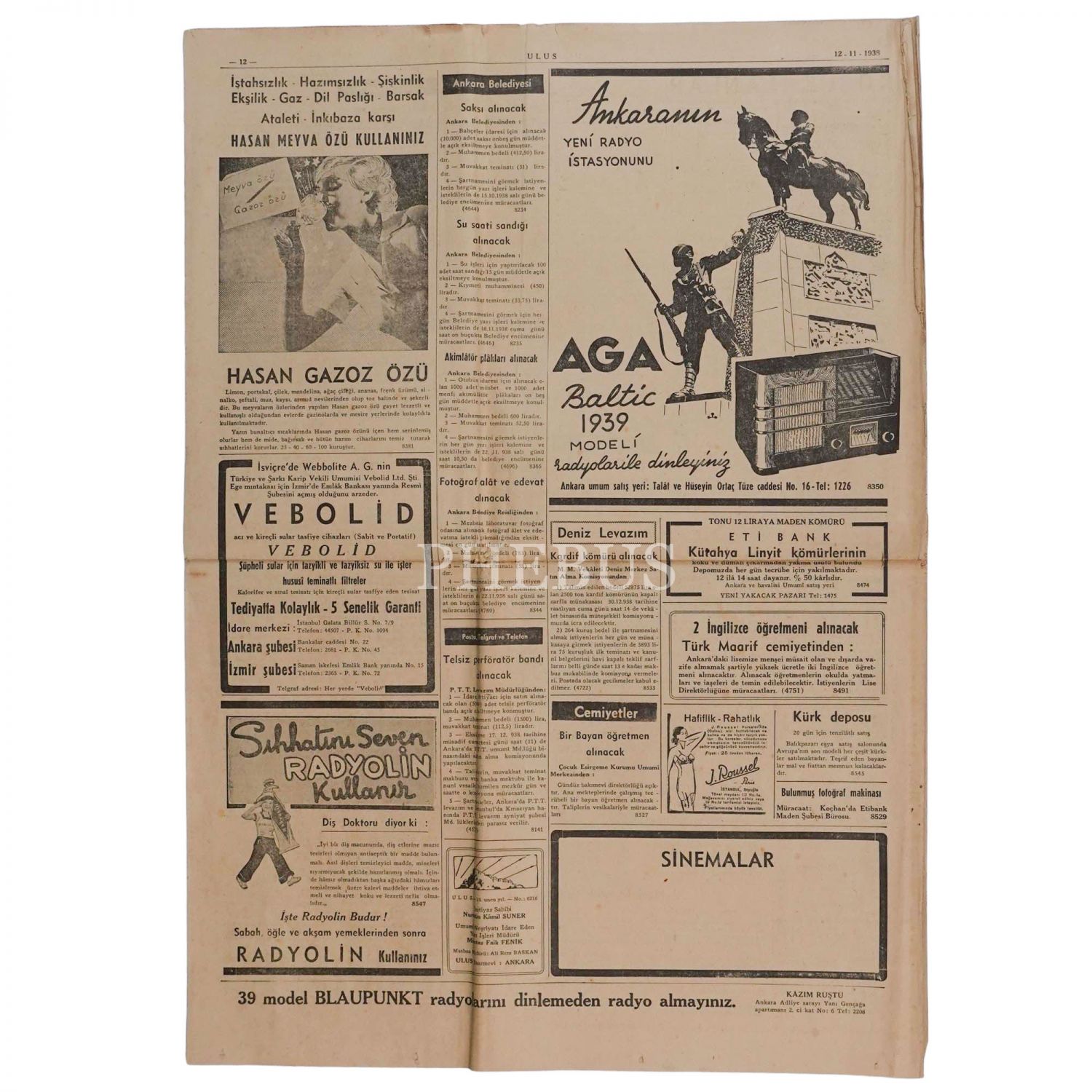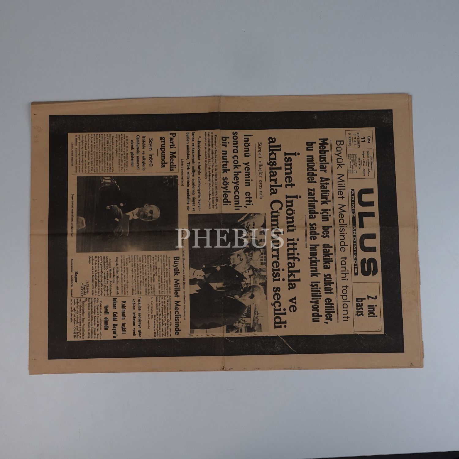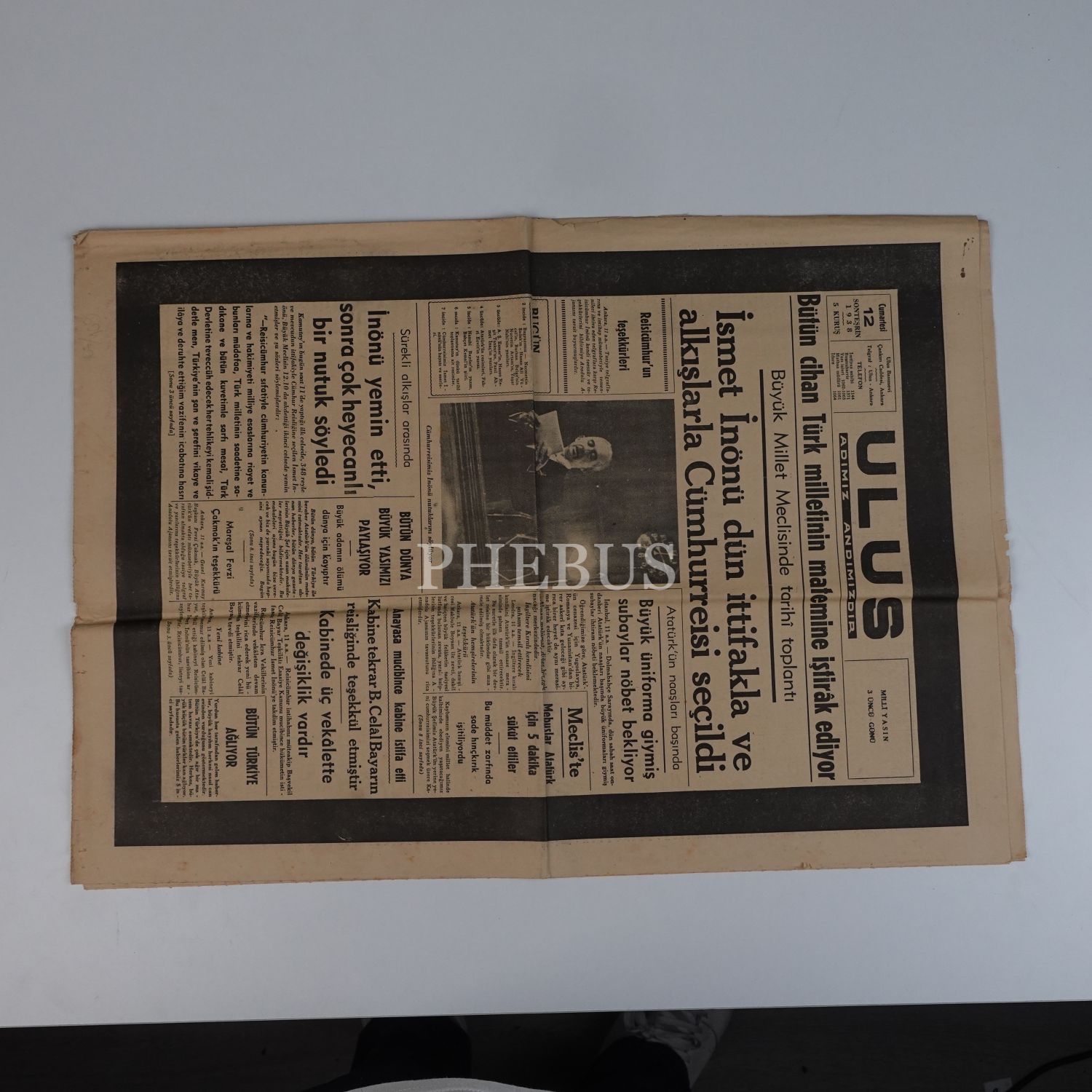 "İsmet İnönü İttifakla ve Alkışlarla Cümhurreisi Seçildi" manşetiyle, Mustafa Kemal Atatürk´ün vefatı sonrası İsmet İnönü´nün Cumhurbaşkanı seçilmesini duyuran ULUS gazetesi, 12 Sonteşrin (Kasım) 1938, 12 sayfa, 42x60 cm...