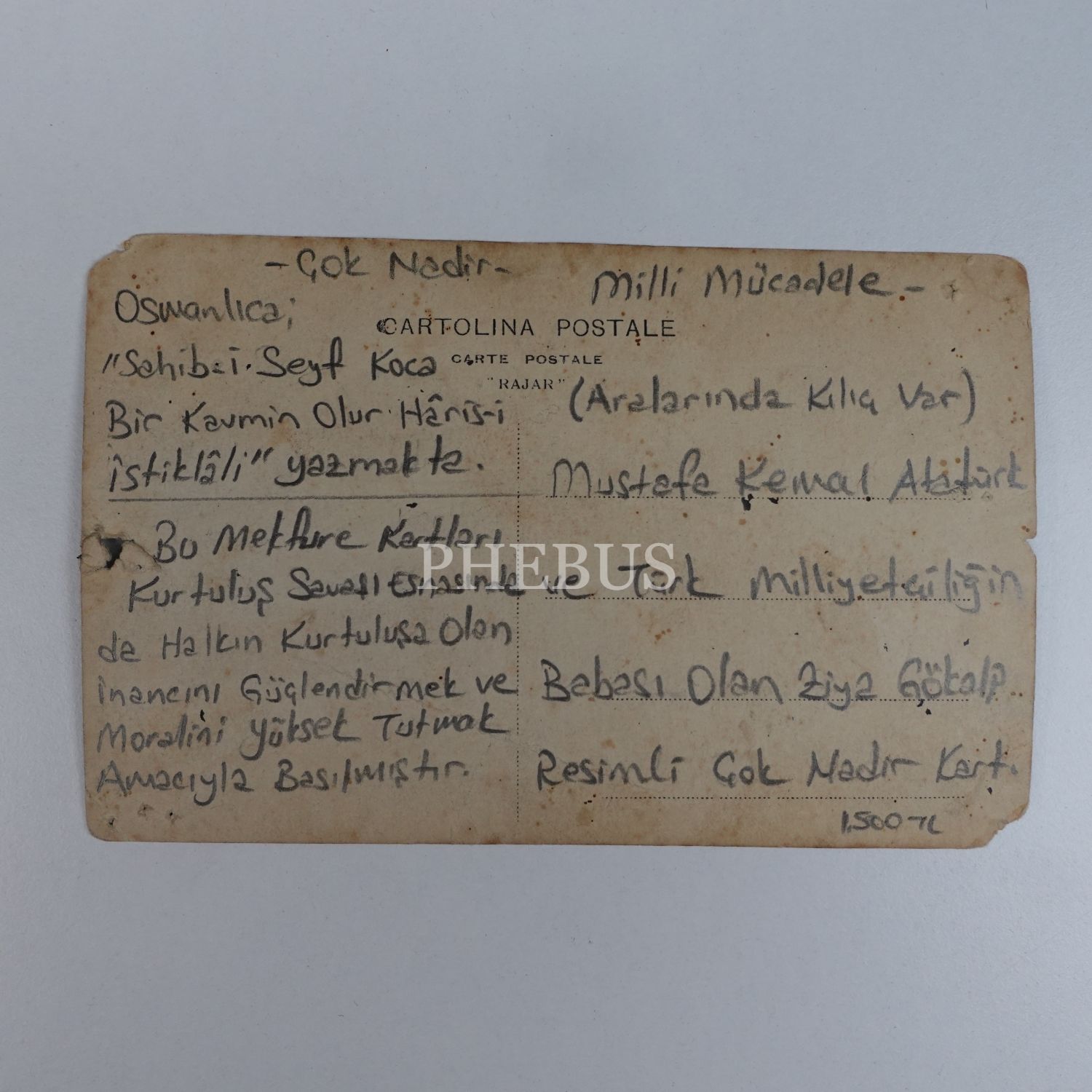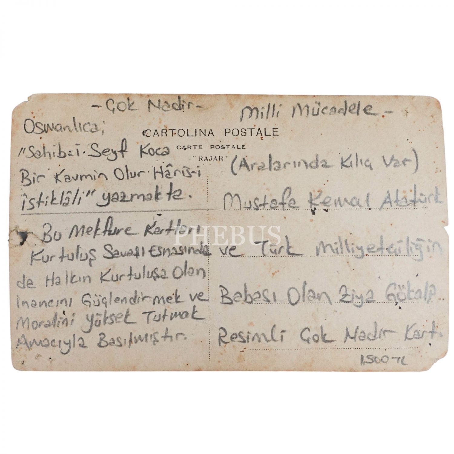 Mustafa Kemal Atatürk portresinin kenarına iliştirilmiş fotokartlarda Kurtuluş Savaşı komutanları görülmektedir. Tevfik Fikret´in kartta yazılı dizeleri: "Koca bir kavmin olur hâris-i istiklâli / Koca bir memleketin ırzı, hayatı, malı /Hep ona vâbeste kalır." *Kart yüzeyinde zamana bağlı yıpranmalar mevcuttur.