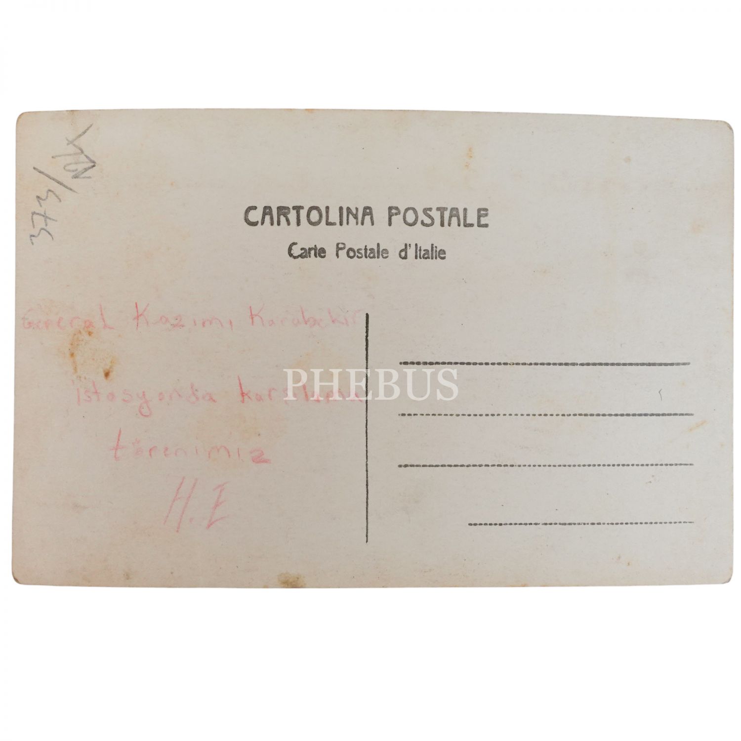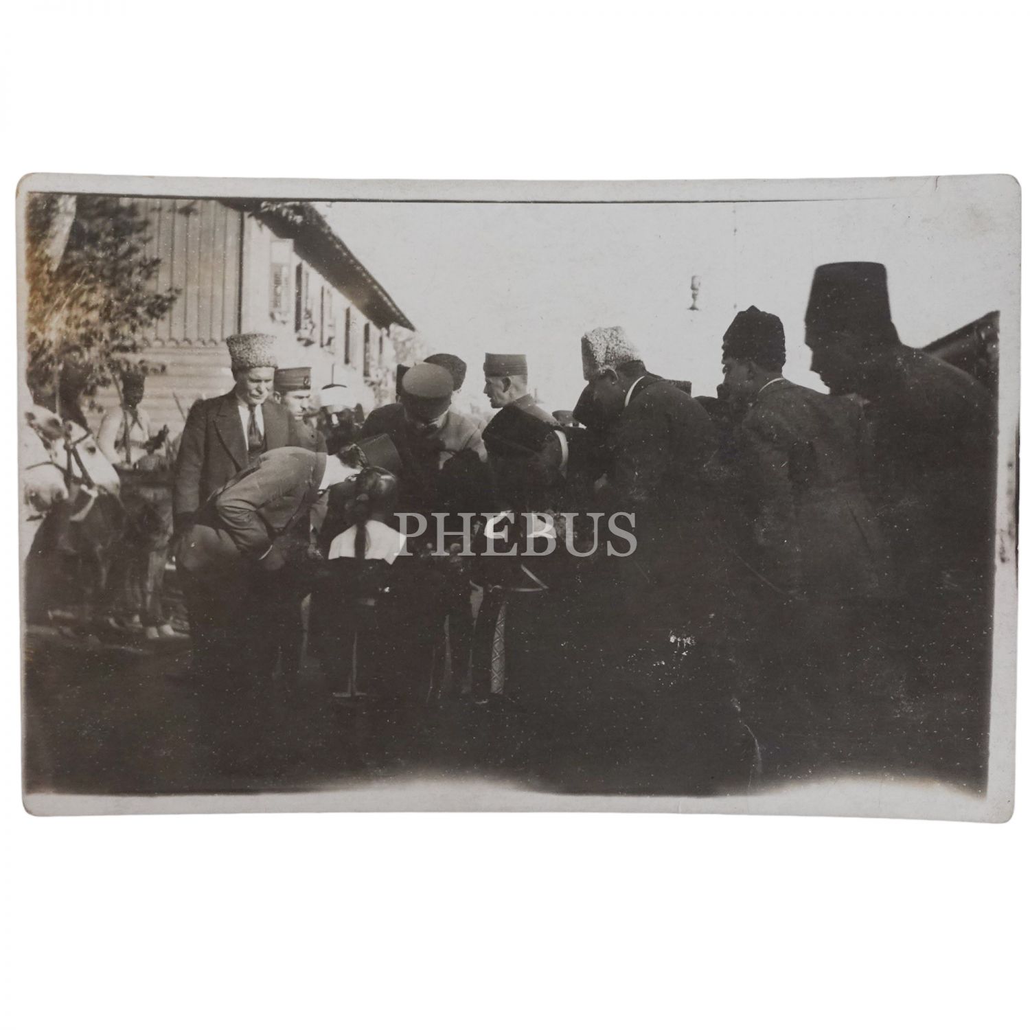 Kazım Karabekir, kendisini karşılamak üzere tren istasyonuna gelen küçük kız öğrencilerin çiçeklerini kabul ediyor, 14x9 cm...