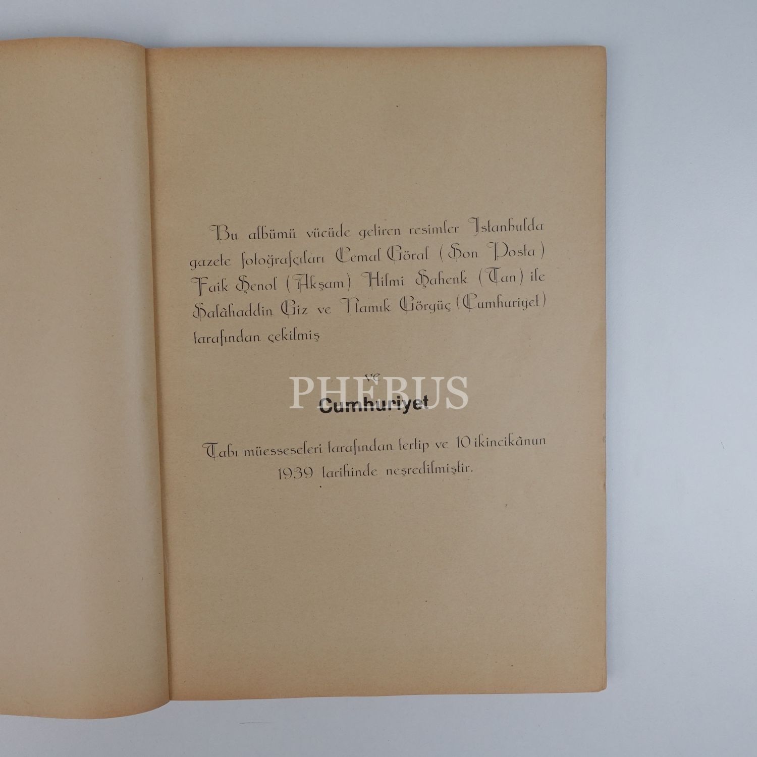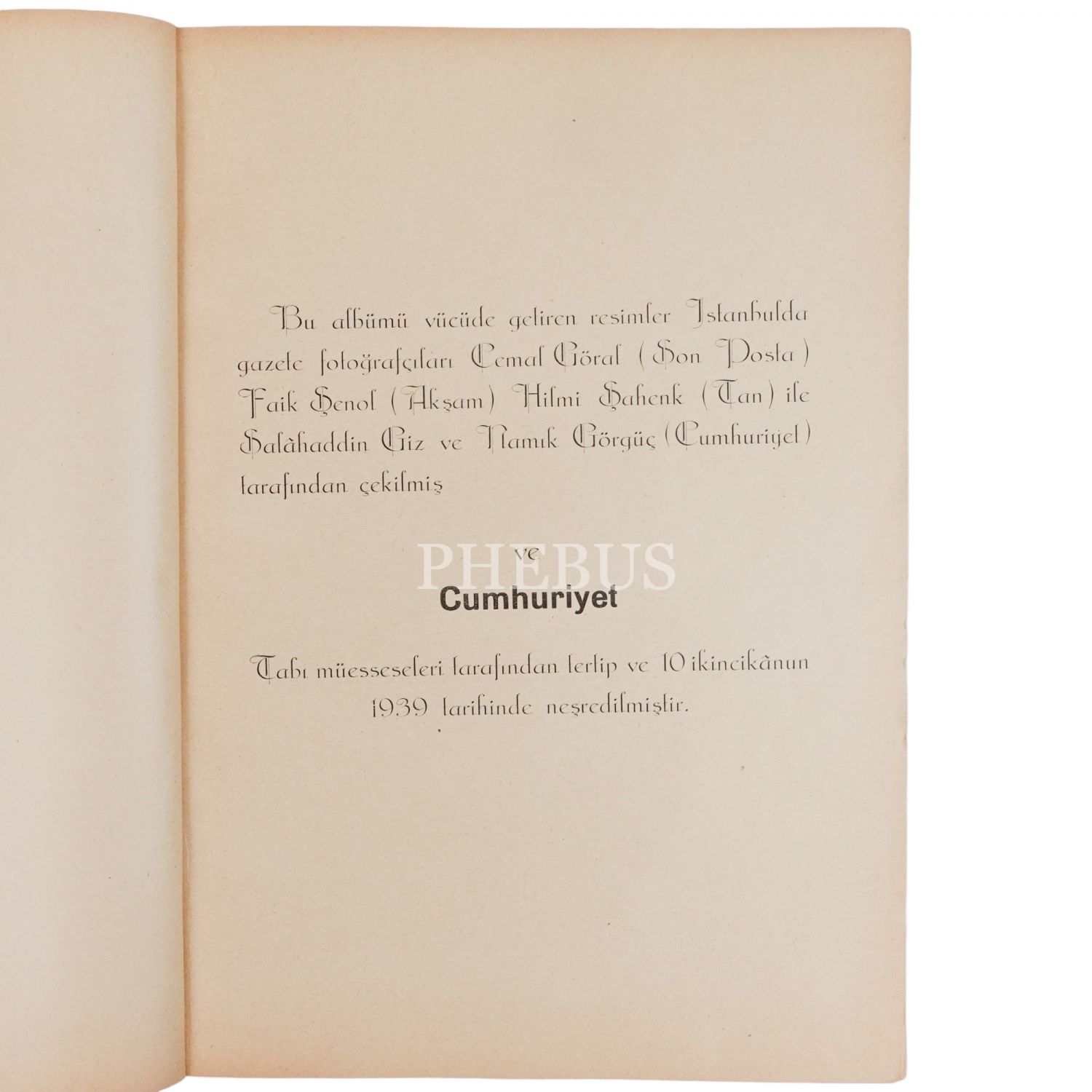 "Bu albümü vücüde getiren resimler İstanbulda gazete fotoğrafçıları Cemal Göral (Son Posta), Faik Şenol (Akşam), Hilmi Şahenk (Tan) ile Salâhaddin Giz ve Namık Görgüç (Cumhuriyet) tarafından çekilmiş ve Cumhuriyeti Tabı müesseseleri tarafından tertip ve 10 İkincikânun 1939 tarihinde neşredilmiştir."