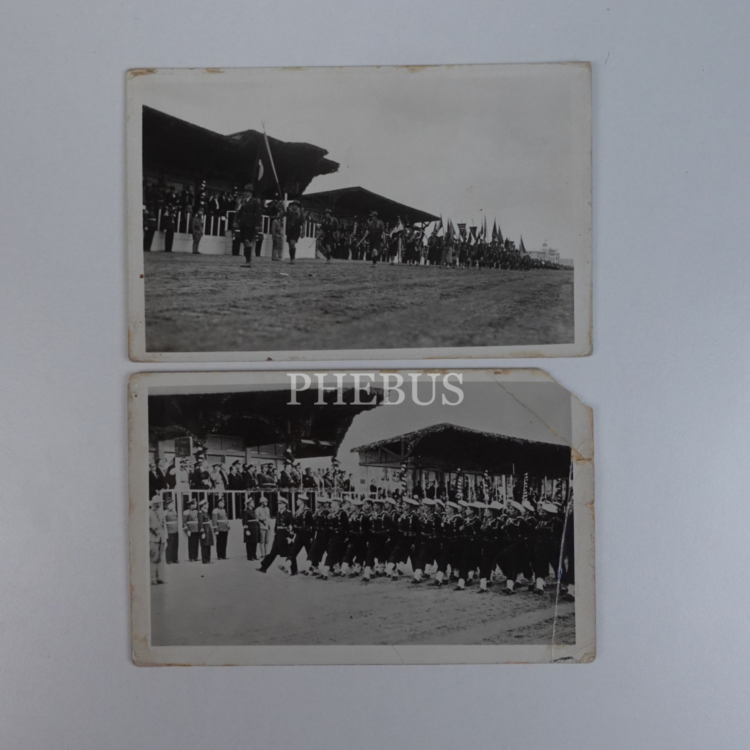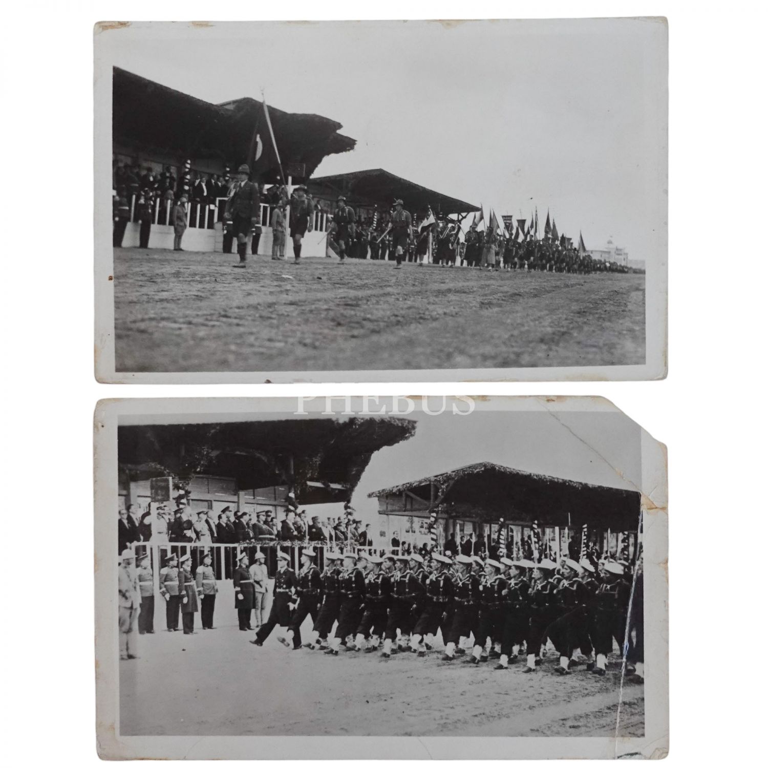 Ankara Hipodromu´nda düzenlenen 10. Yıl törenlerinde, Mustafa Kemal Atatürk´ün bulunduğu protokolün önünden geçen izci öğrencilerin ve Türk deniz piyadelerinin görüldüğü 2 adet fotoğraf, 14x9 cm...