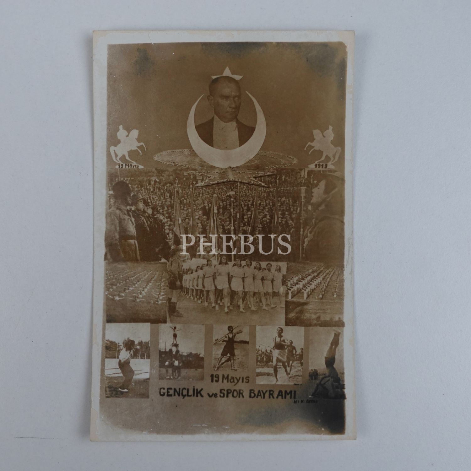Ay-yıldız içinde Mustafa Kemal Atatürk portresi başta olmak üzere 19 Mayıs Gençlik ve Spor Bayramı törenlerine katılan genç sporcularımızın fotoğafları kullanılarak hazırlanmış hatıra kolajı, 9x14 cm...